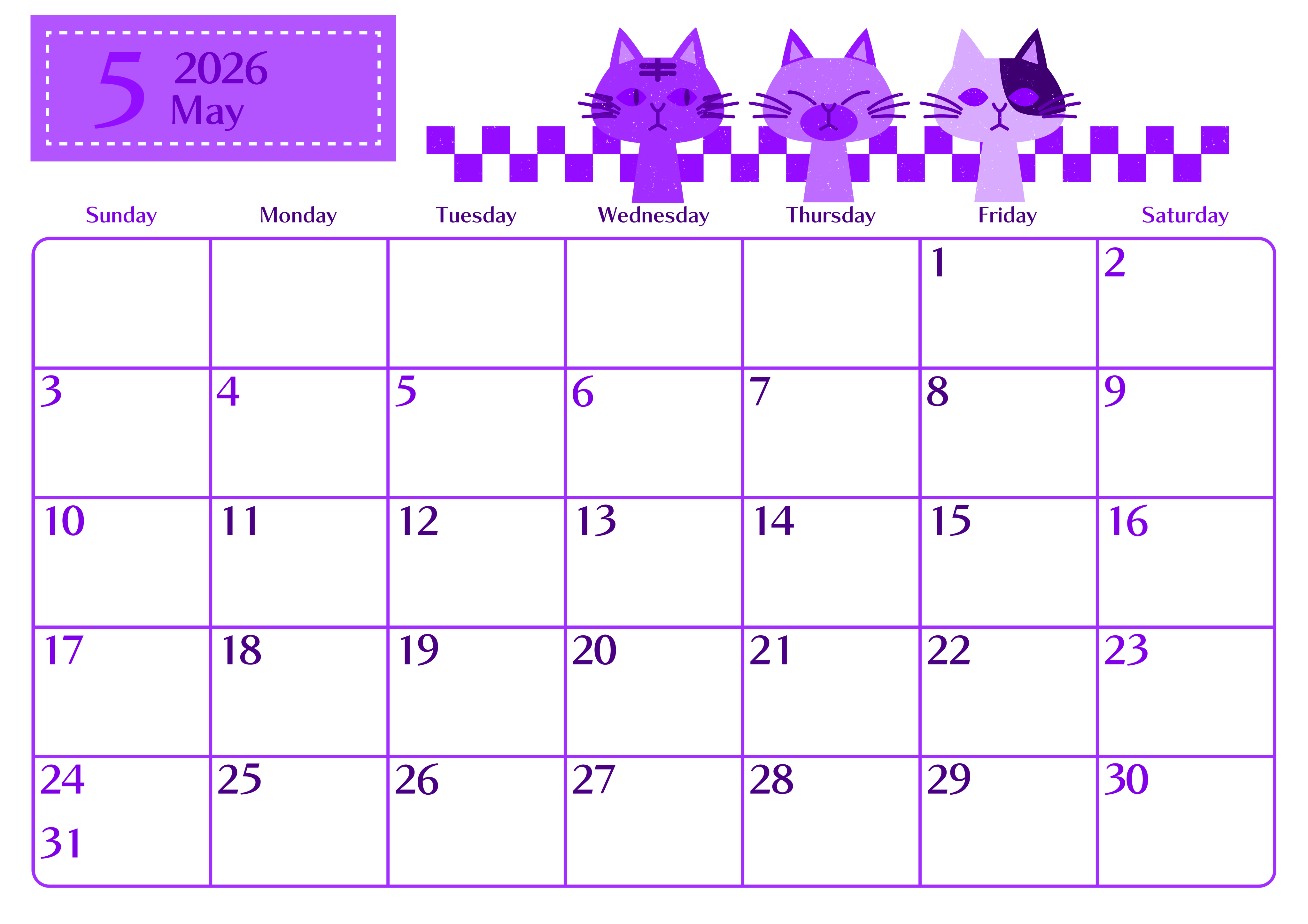 2026年5月横型日曜始まりの無料テンプレートパープルのカレンダーです。3匹の猫が並んでいる様子がおしゃれなデザインのイラストパープルのカレンダーです。日曜始まりで曜日ごとに文字の色分けがされているので見やすい工夫もされています。(2026-01020500)