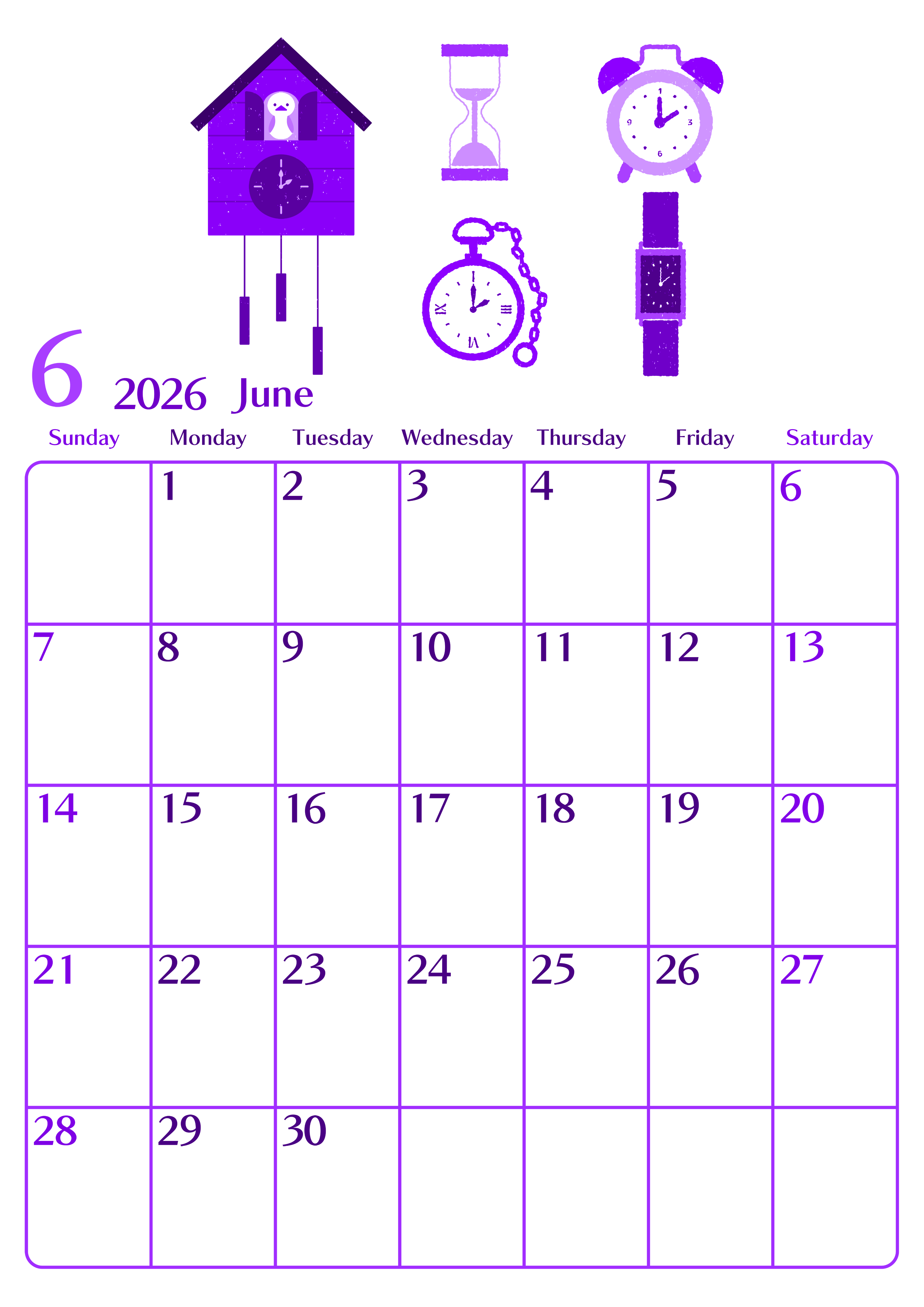 2026年6月縦型日曜始まりの無料テンプレートパープルのカレンダーです。砂時計や腕時計や掛け時計、あなたはどのタイプの時計が好きですか?おしゃれで縦型イラスト付きのパープルのカレンダーなので壁に貼って使うのをおすすめします。(2026-01020610)