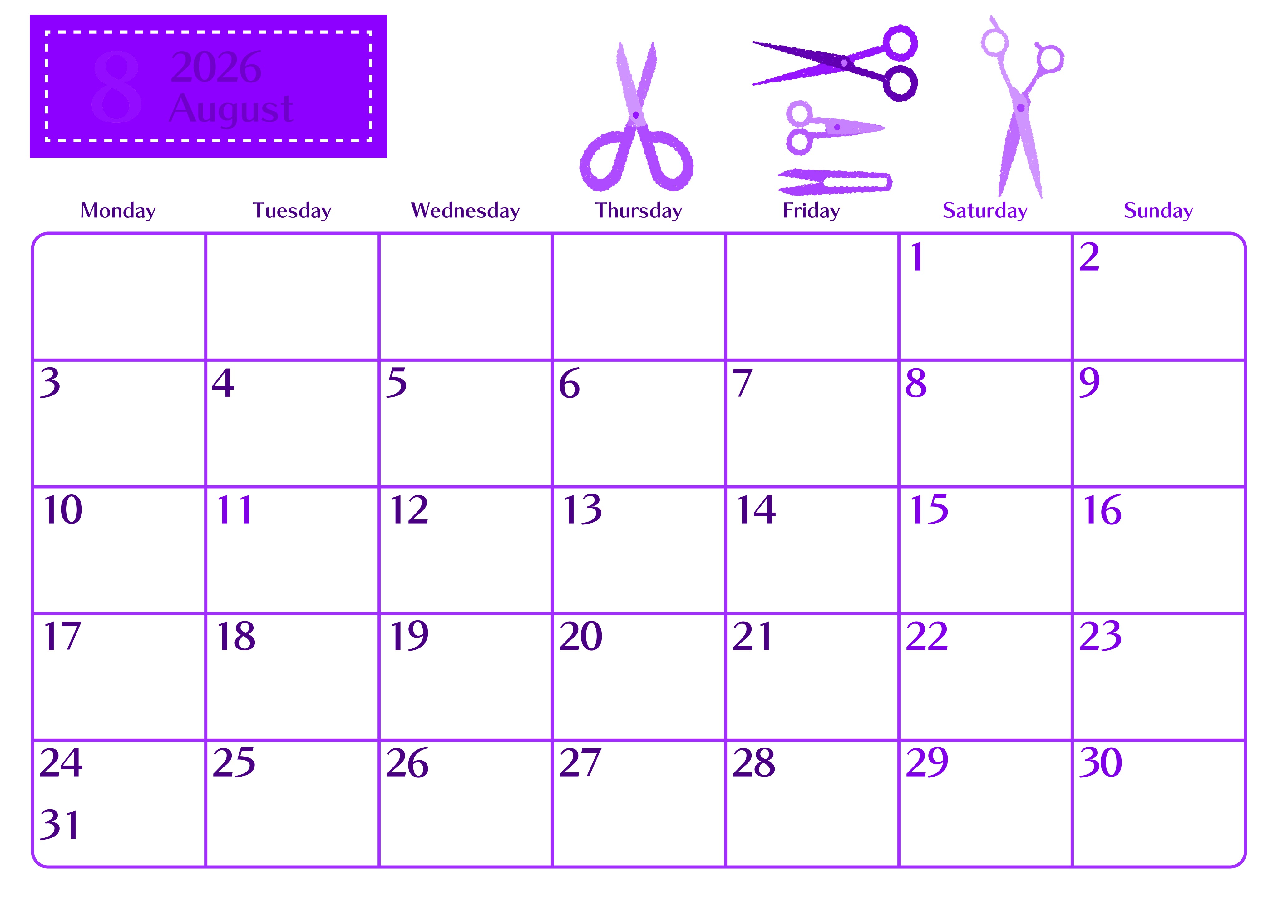 2026年8月横型月曜始まり ハサミイラストのおしゃれA4無料パープルのカレンダー(2026-01020801)