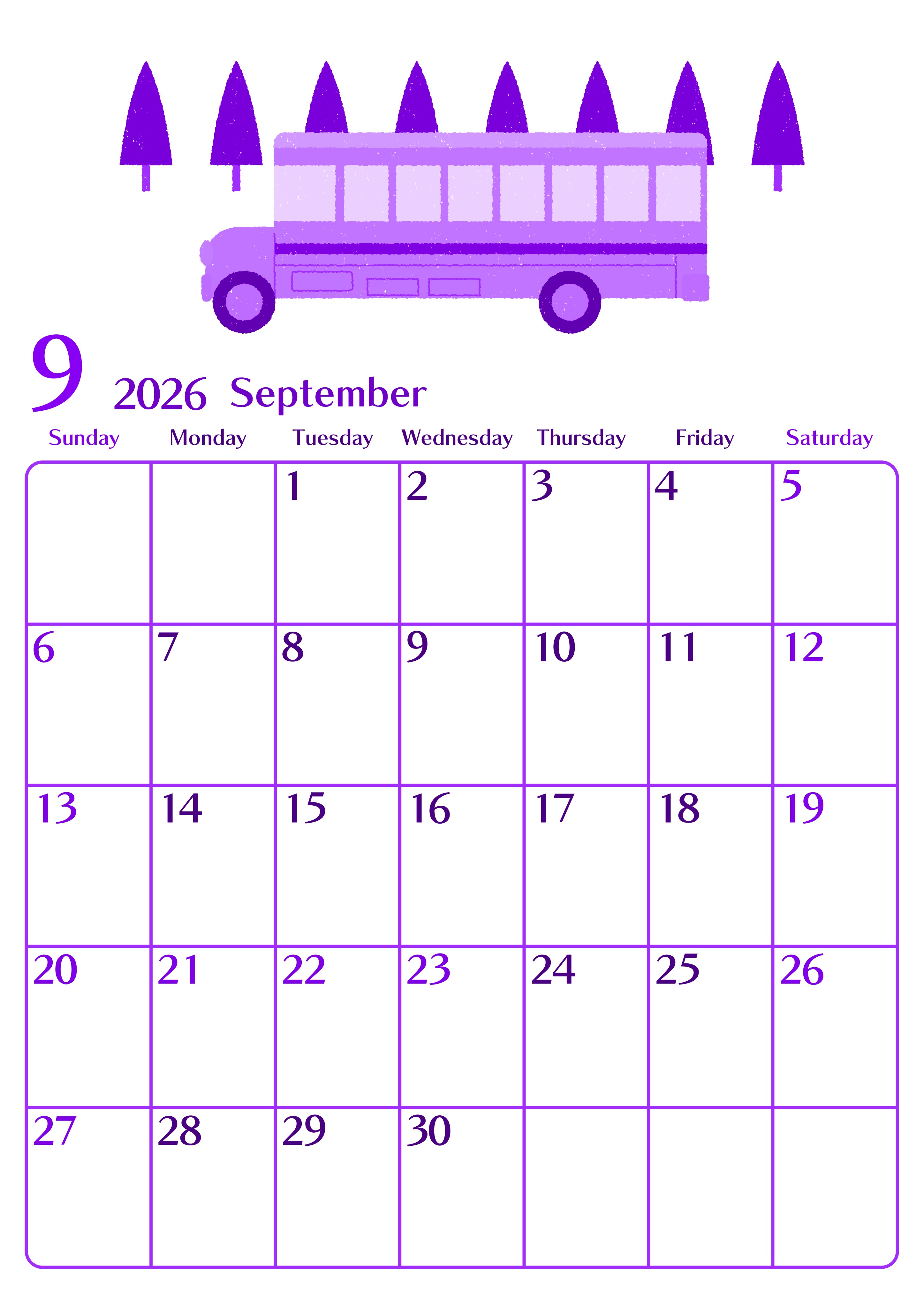 2026年9月縦型日曜始まりの無料テンプレートパープルのカレンダーです。夏休み明けの憂鬱な気持ちを吹き飛ばしてくれるような軽快でおしゃれなバスのイラストが添えられている縦型見やすいレイアウトのパープルのカレンダーです。(2026-01020910)