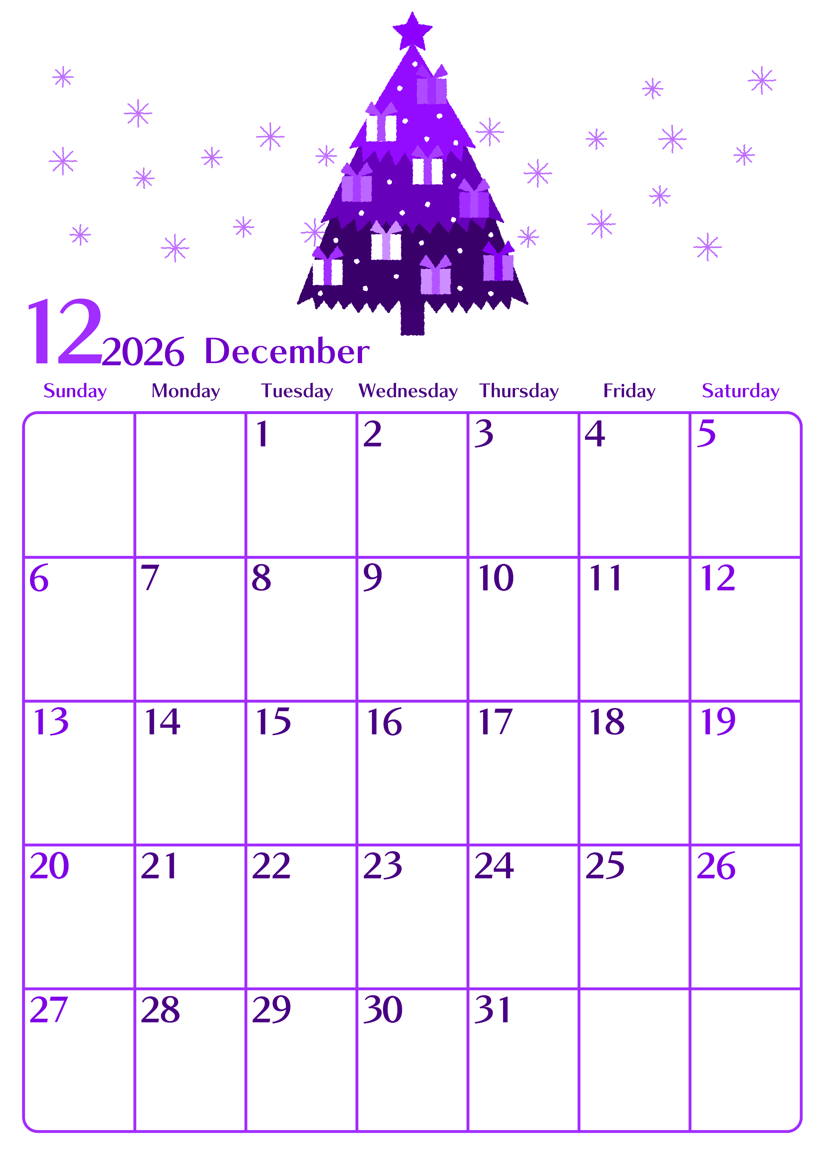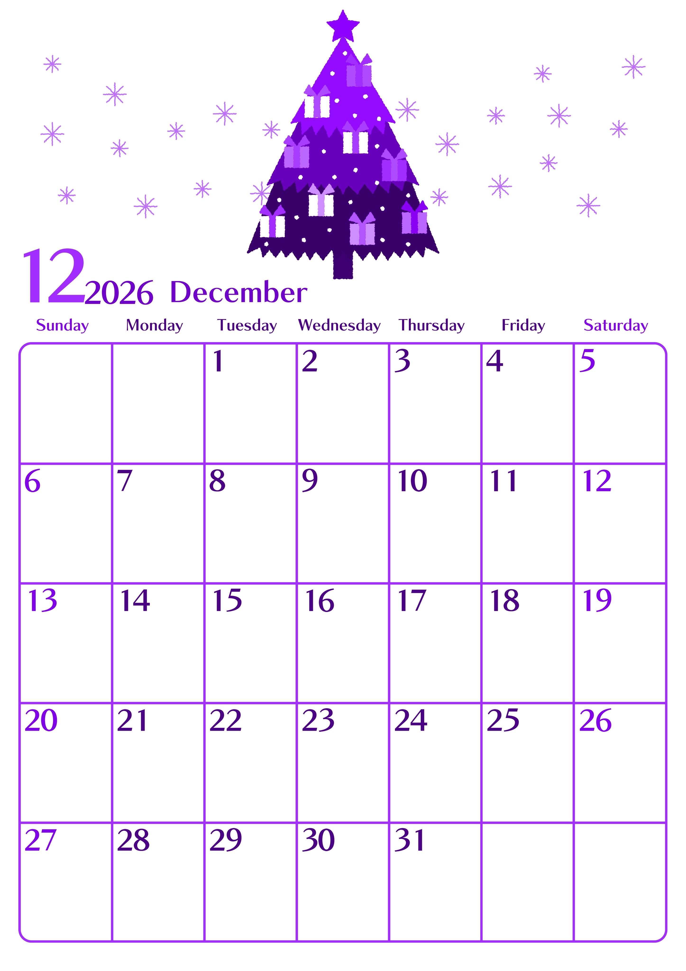 2026年12月縦型日曜始まりの無料テンプレートパープルのカレンダーです。クリスマスのワクワク感をテーマに取り上げたクリスマスツリーのイラストがおとなっぽくておしゃれな年末の予定を立てるのが楽しくなるパープルのカレンダーフリー素材です。(2026-01021210)