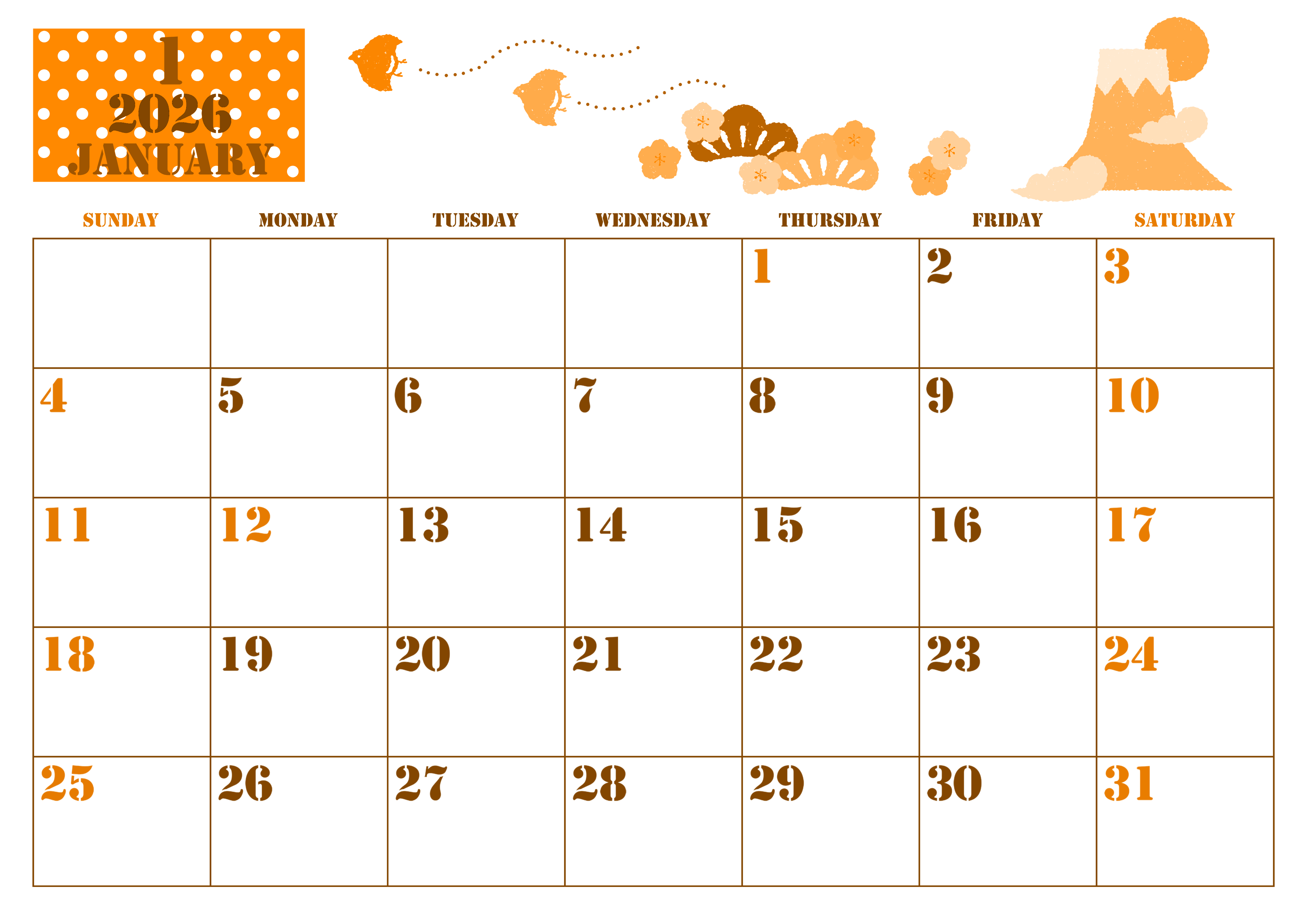 2026年1月横型日曜始まり ポップな富士山イラストのかわいいA4無料オレンジのカレンダー(2026-01030100)