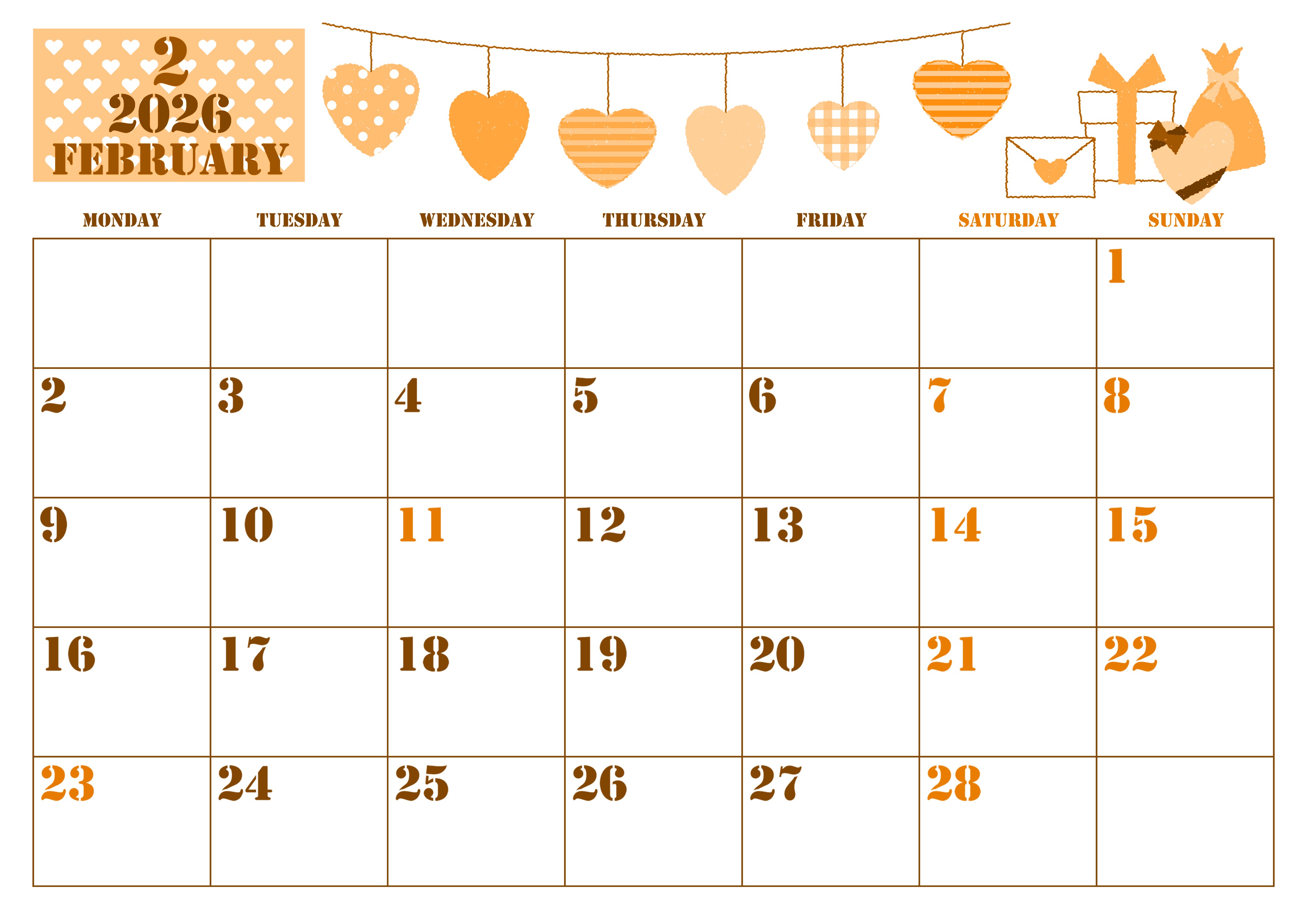 2026年・無料のカレンダーテンプレート 2026年2月横型月曜始まり ラブレターイラストのかわいいA4無料オレンジのカレンダー(2026-01030201) 素材状デザイン王 2025年4月7日 2026年2月横型月曜始まりの無料テンプレートオレンジのカレンダーです。シマシマ、水玉、チェックと様々なデザインのハートがかわいいタスク管理に使いやすい月曜始まりの無料オレンジのカレンダーです。(2026-01030201) 2月 横型のカレンダー 月曜始まり オレンジ カレンダーデザイン-0103