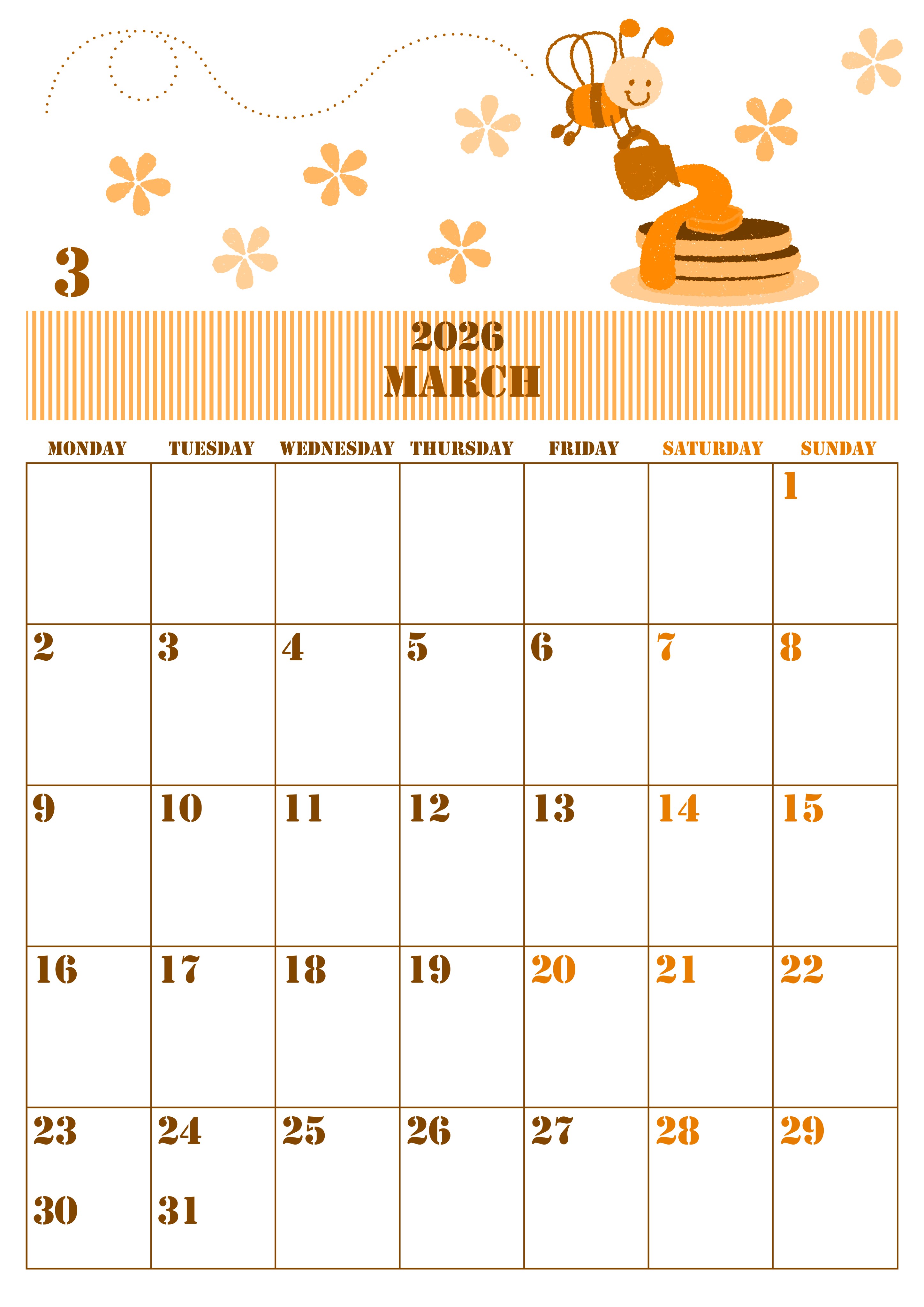 2026年3月縦型月曜始まりの無料テンプレートオレンジのカレンダーです。たっぷりのメープルシロップをミツバチが一生懸命かけているかわいいフリー素材のイラストです。月曜始まりオレンジのカレンダーなので予定管理に最適です。(2026-01030311)