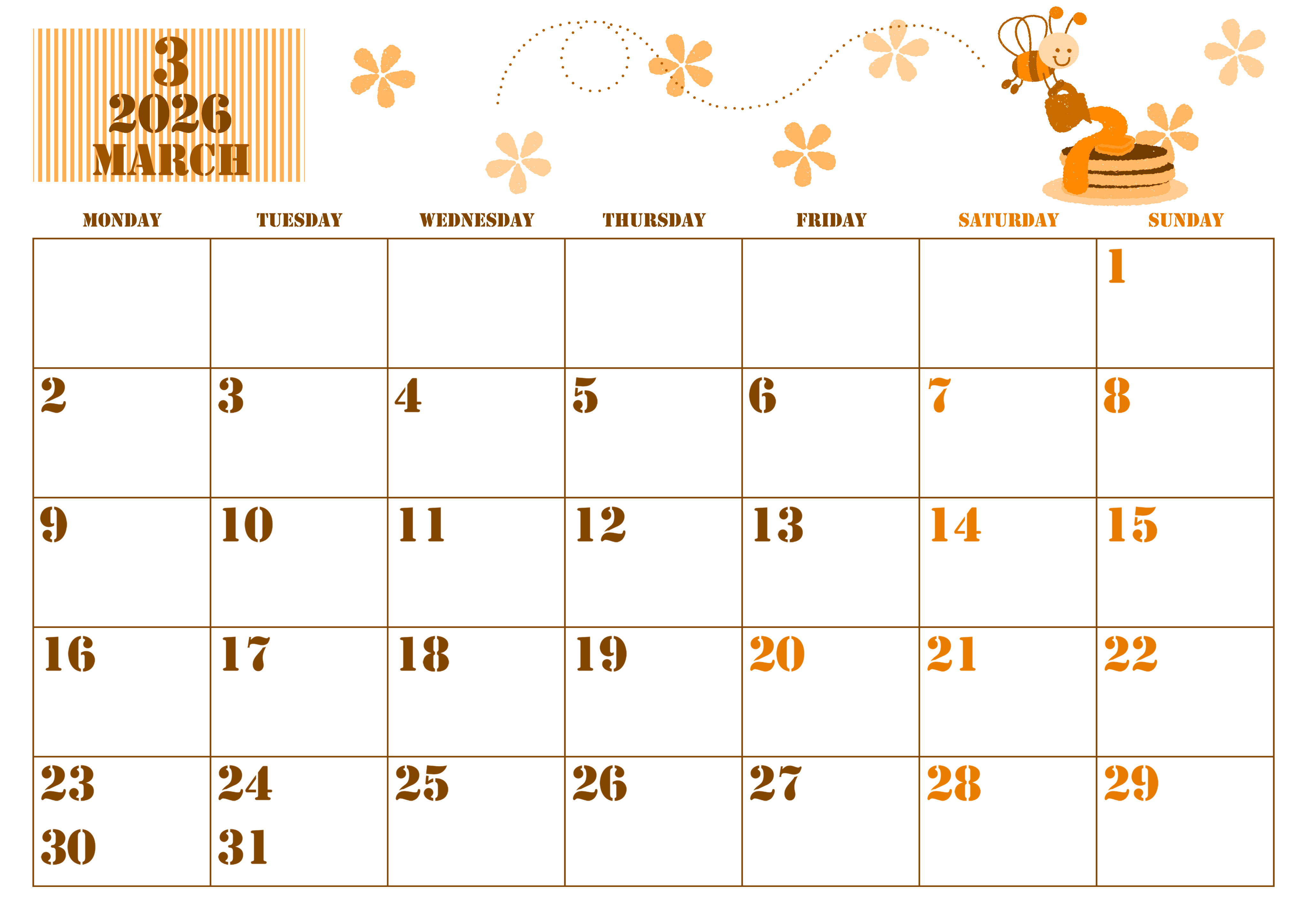 2026年3月横型月曜始まりの無料テンプレートオレンジのカレンダーです。花が散りばめられる中を笑顔のミツバチがパンケーキにトッピングしているかわいいイラストの月曜始まりオレンジのカレンダーです。(2026-01030301)