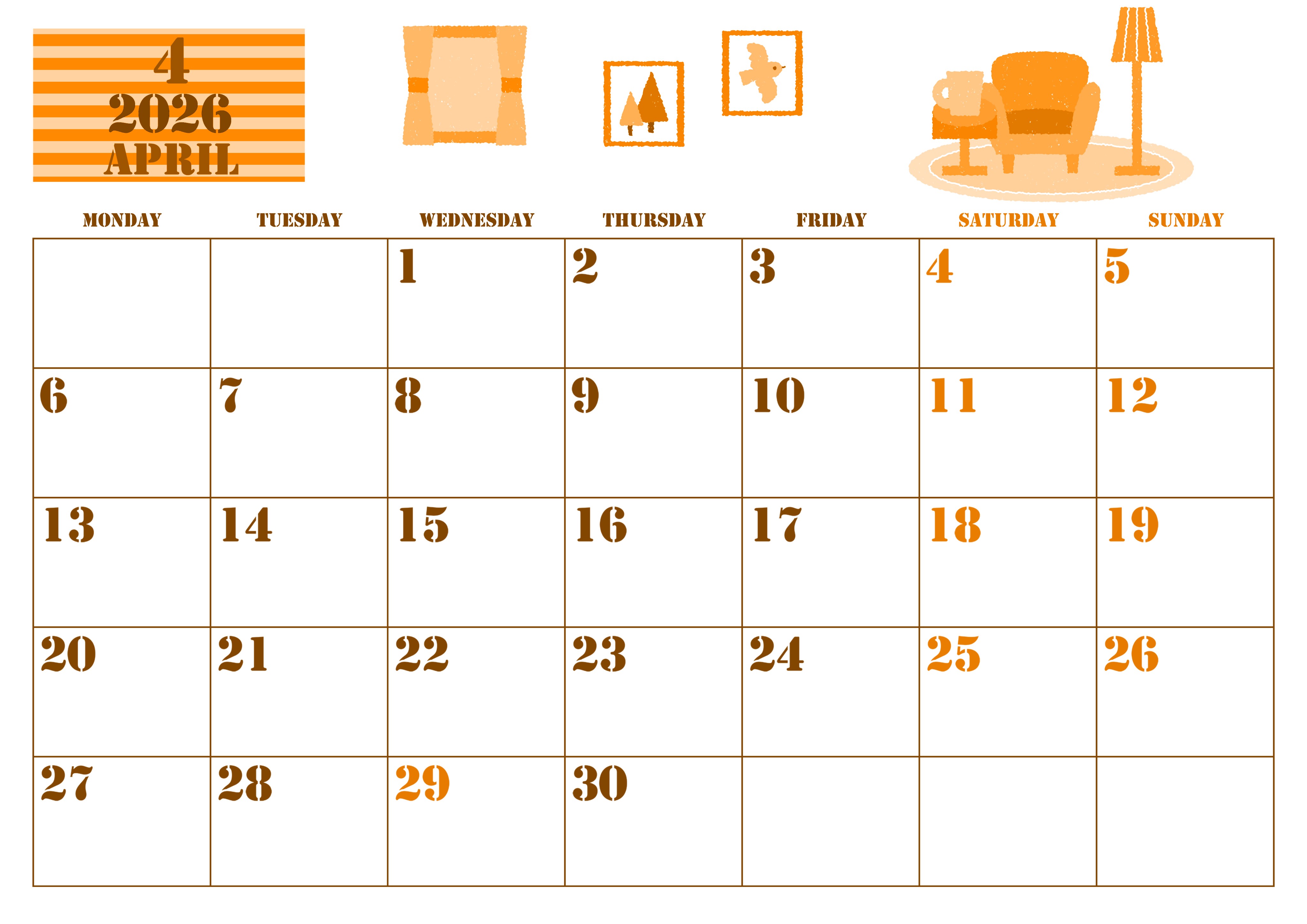 2026年・無料のカレンダーテンプレート 2026年4月横型月曜始まり 新生活イラストのかわいいA4無料オレンジのカレンダー(2026-01030401) 素材状デザイン王 2025年4月7日 2026年4月横型月曜始まりの無料テンプレートオレンジのカレンダーです。家具がかわいい新生活の不安を吹き飛ばしてくれるようなイラストが目を引くテンプレートオレンジのカレンダーとなっています。(2026-01030401) 4月 横型のカレンダー 月曜始まり オレンジ カレンダーデザイン-0103