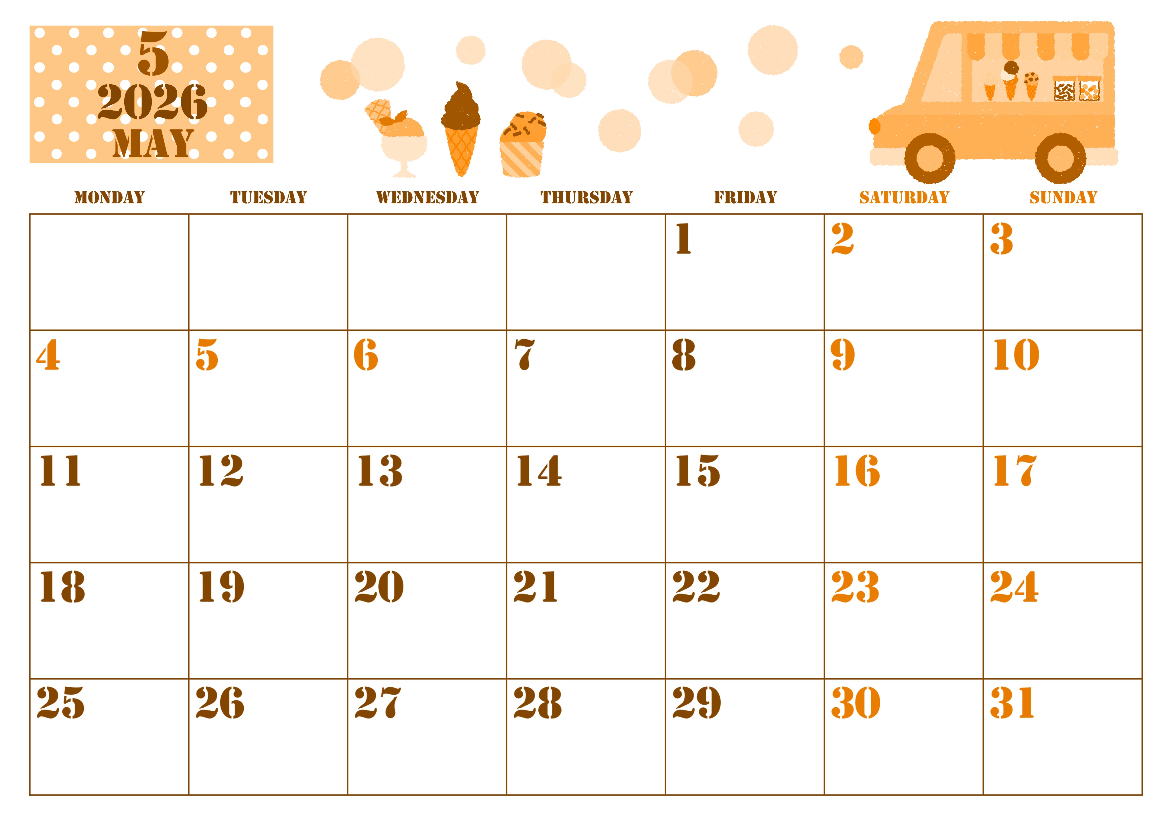 2026年5月横型月曜始まりの無料テンプレートオレンジのカレンダーです。月曜始まりのオレンジのカレンダーにこだわりのある方におすすめです。アイスクリームのイラストもかわいいので使っていて毎日がウキウキします。(2026-01030501)