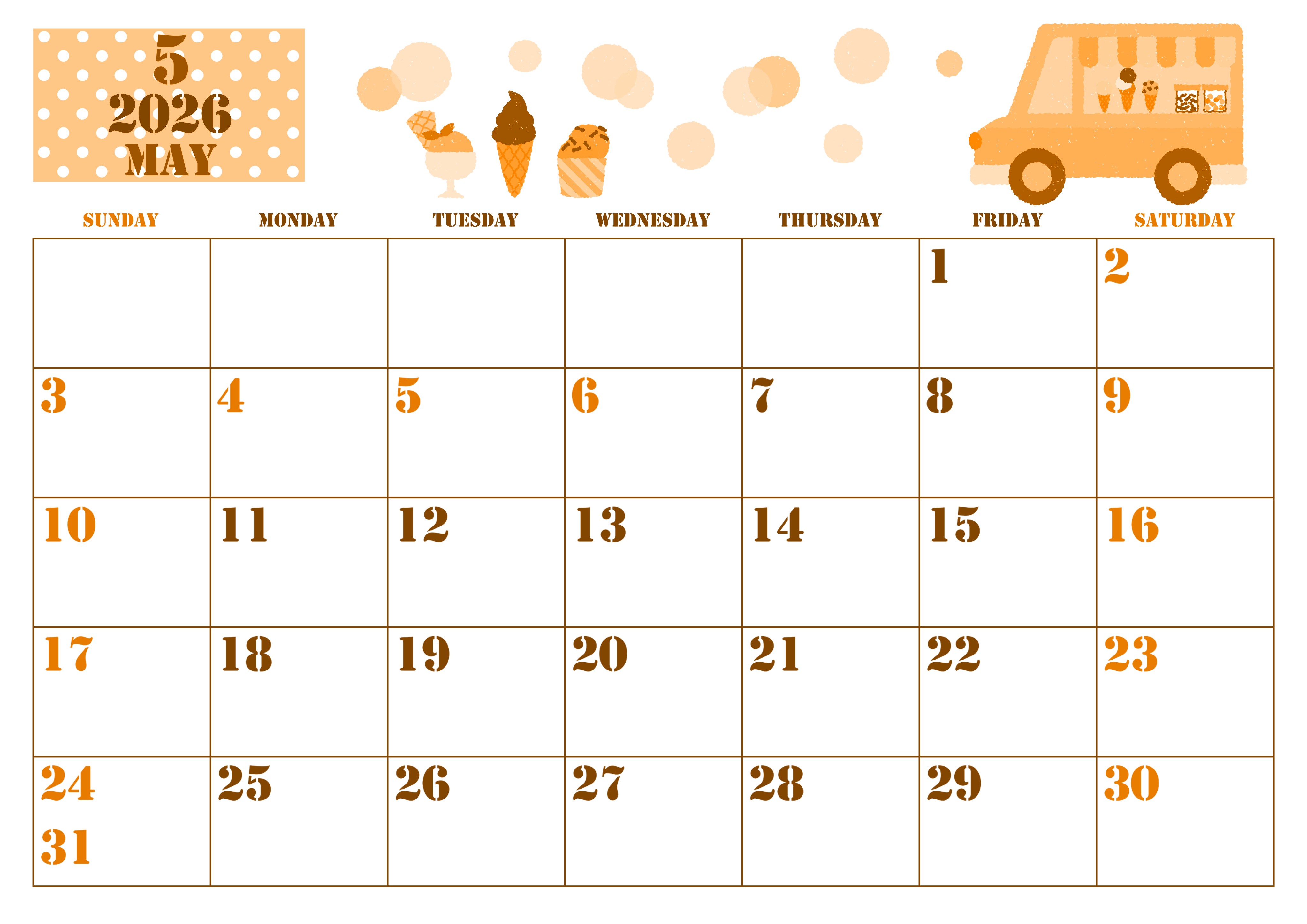 2026年5月横型日曜始まりの無料テンプレートオレンジのカレンダーです。いろいろな種類のアイスクリームが食欲をそそるかわいいデザインのオレンジのカレンダーです。イラスト部分よりも記入欄の方が大きめに確保されているので使いやすいです。(2026-01030500)