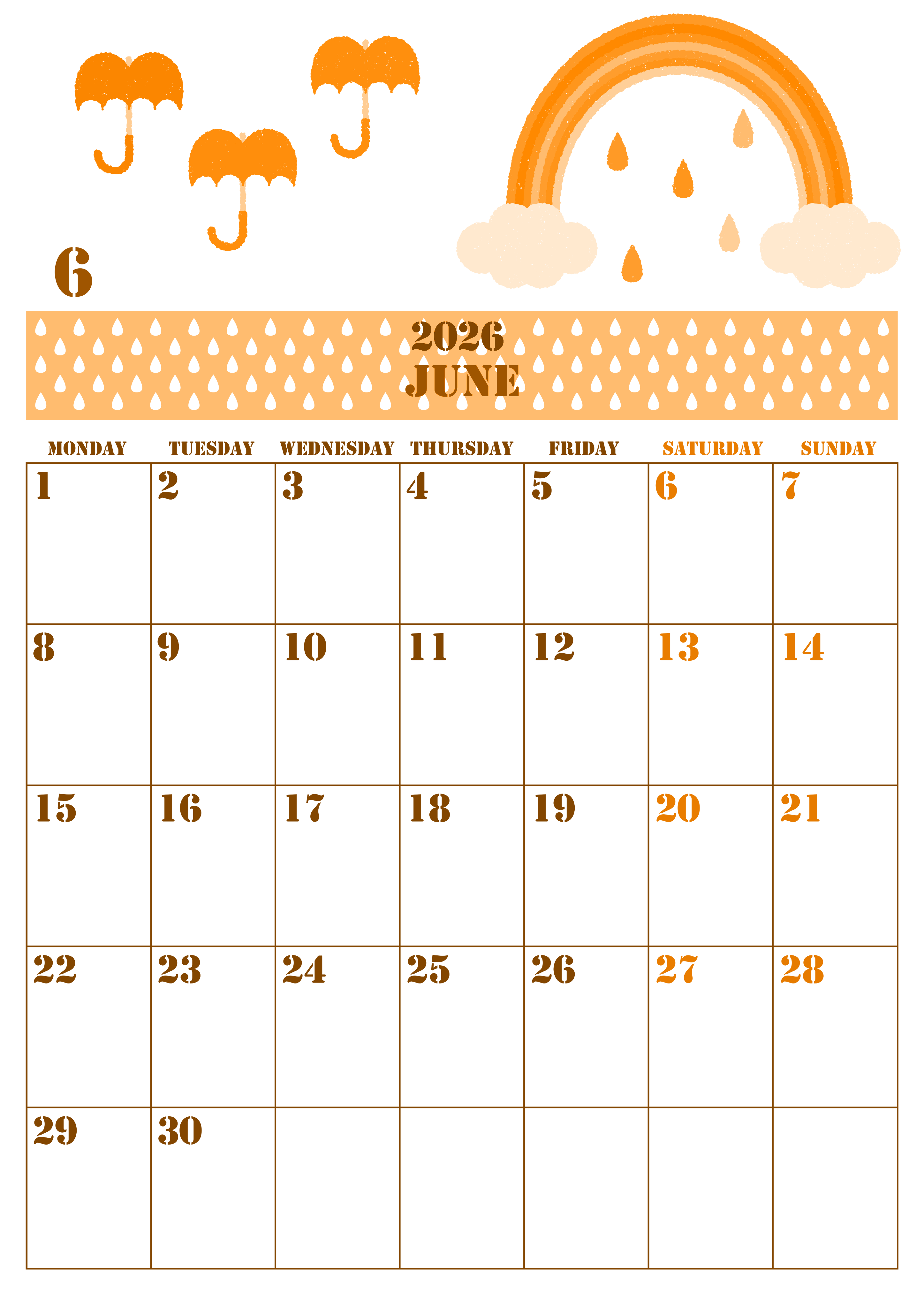 2026年6月縦型月曜始まりの無料テンプレートオレンジのカレンダーです。日付の文字が曜日によって色分けされているのでパッと見て見間違う事無く使い勝手の良い月曜始まりのオレンジのカレンダーです。虹のイラストもかわいいところがポイントです。(2026-01030611)