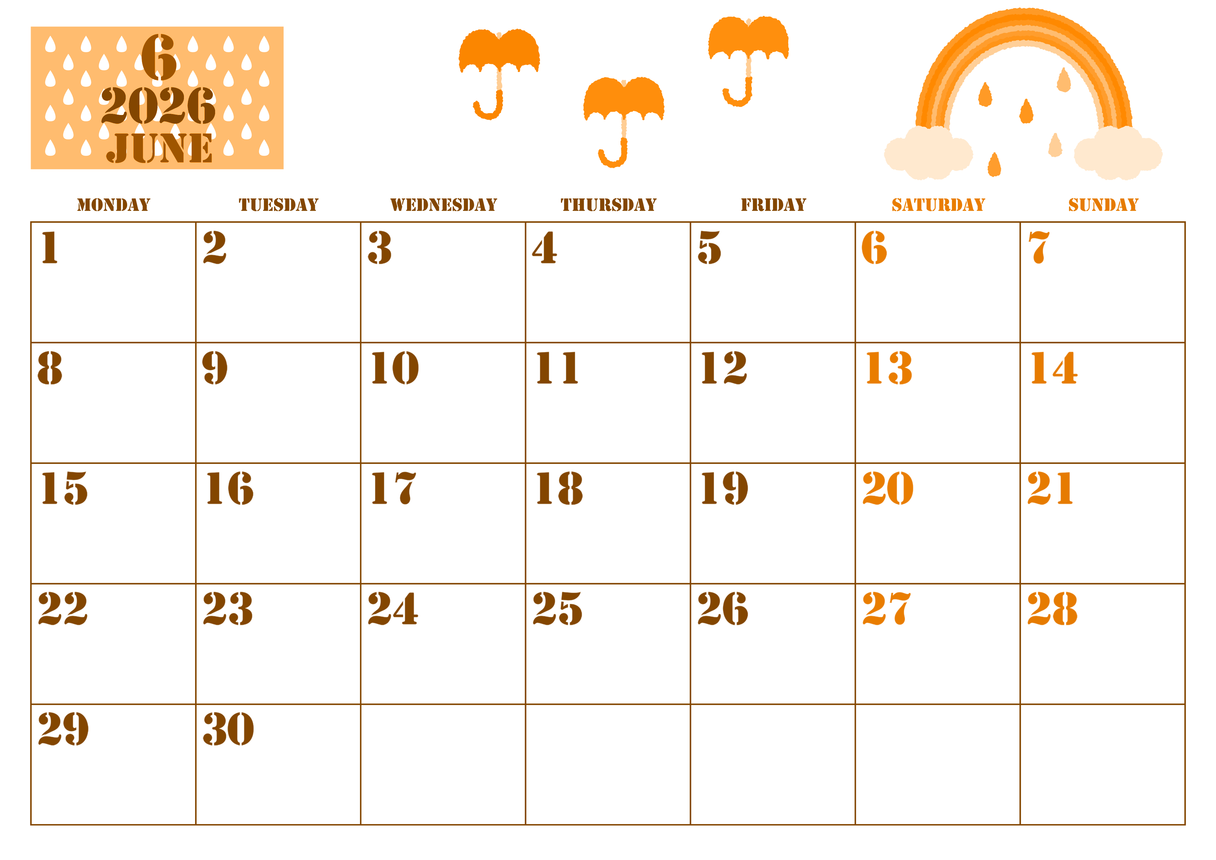 2026年・無料のカレンダーテンプレート 2026年6月横型月曜始まり 虹イラストのかわいいA4無料オレンジのカレンダー(2026-01030601) 素材状デザイン王 2025年4月7日 2026年6月横型月曜始まりの無料テンプレートオレンジのカレンダーです。月曜始まりで仕事や勉強のタスク管理をしたいという人におすすめしたい虹のイラストがかわいいオレンジのカレンダーの無料素材です。(2026-01030601) 6月 横型のカレンダー 月曜始まり オレンジ カレンダーデザイン-0103