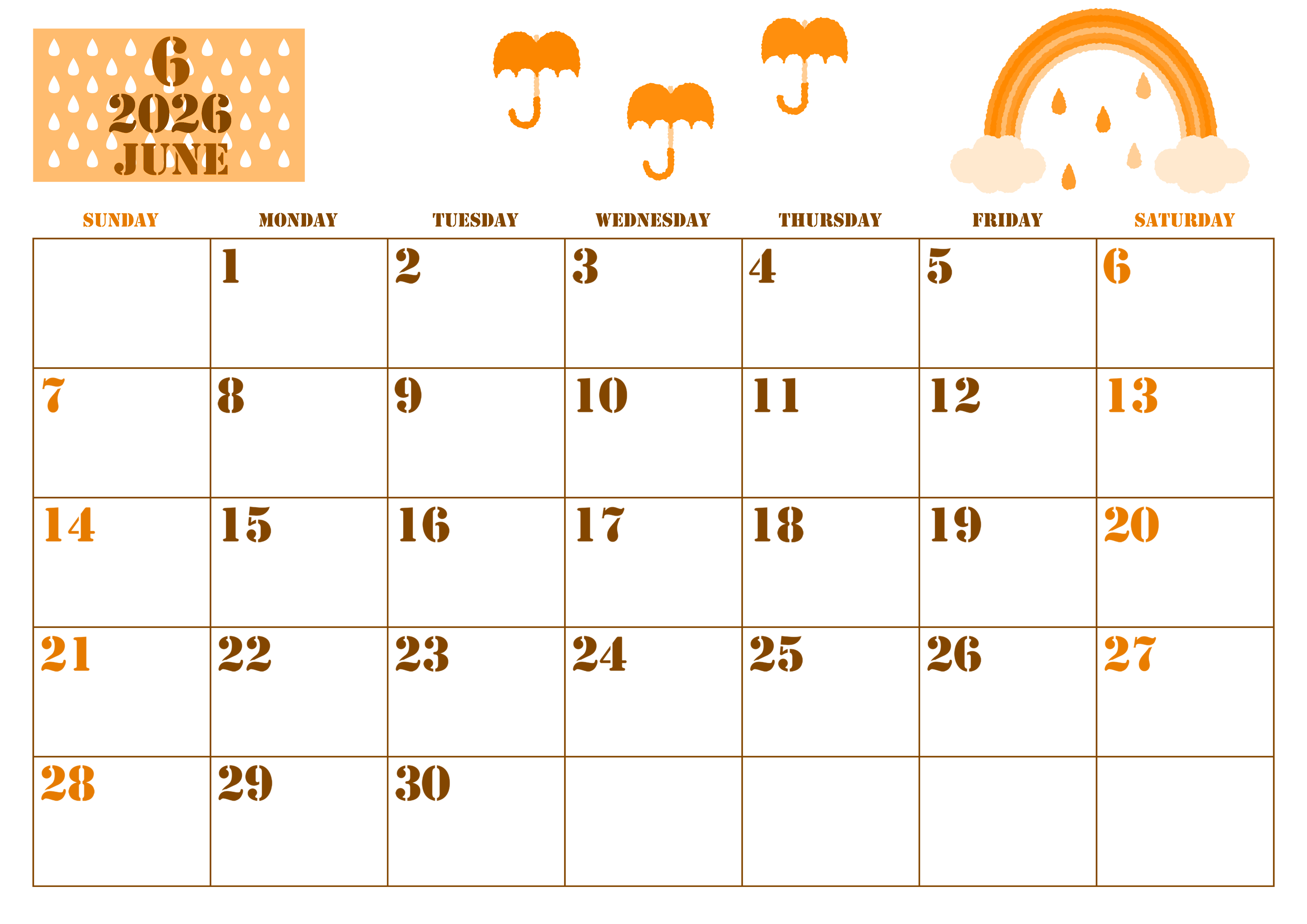 2026年・無料のカレンダーテンプレート 2026年6月横型日曜始まり 虹イラストのかわいいA4無料オレンジのカレンダー(2026-01030600) 素材状デザイン王 2025年4月7日 2026年6月横型日曜始まりの無料テンプレートオレンジのカレンダーです。虹やパラソルのイラストがポップでかわいい無料でダウンロードを行える使いやすくて便利なオレンジのカレンダー無料素材です。(2026-01030600) 6月 横型のカレンダー 日曜始まり オレンジ カレンダーデザイン-0103