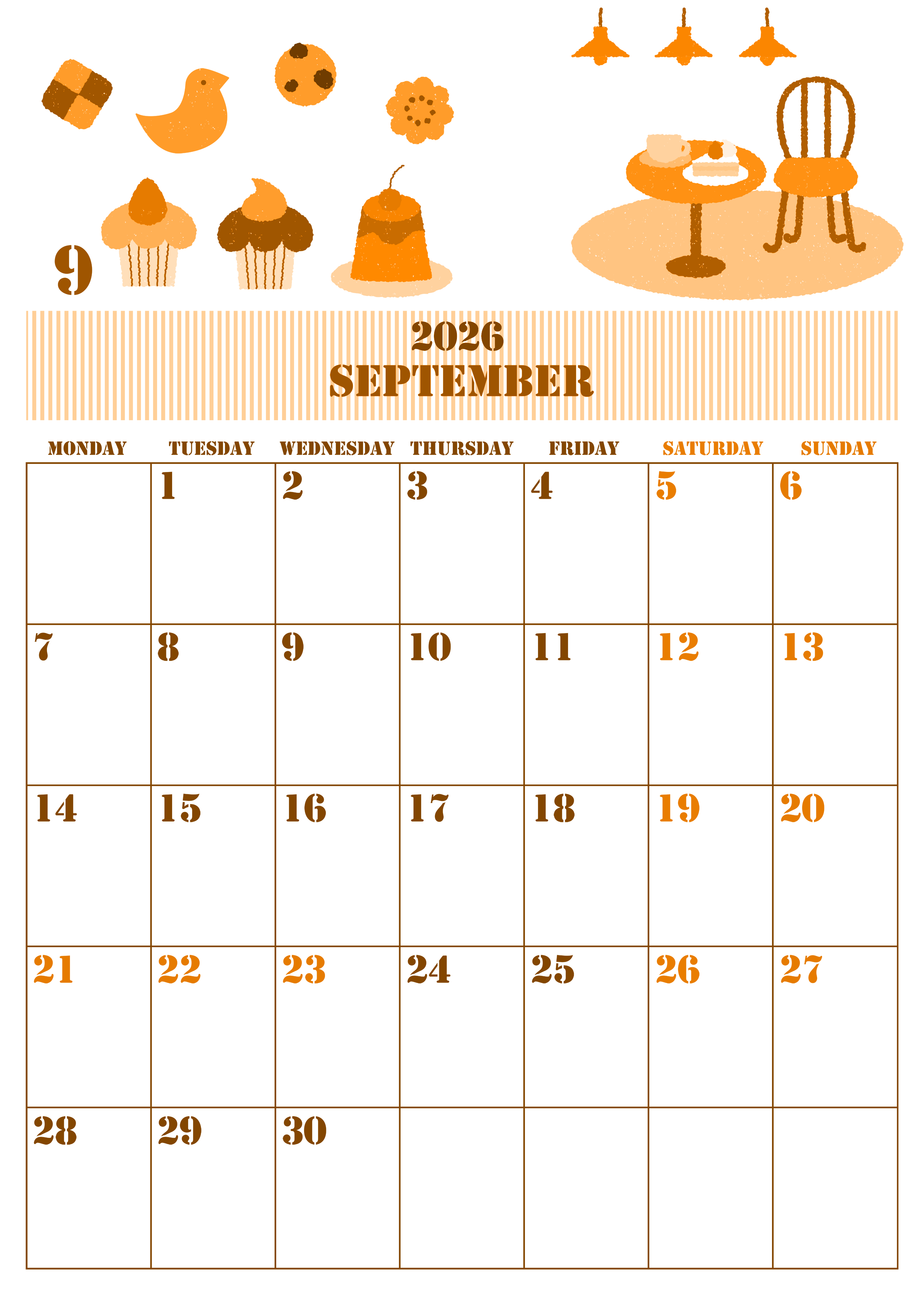 2026年9月縦型月曜始まりの無料テンプレートオレンジのカレンダーです。食欲の秋に食べたくなるいろいろな種類のカップケーキのイラストがとてもかわいい女心をくすぐるような魅力的な月曜始まりオレンジのカレンダーです。(2026-01030911)