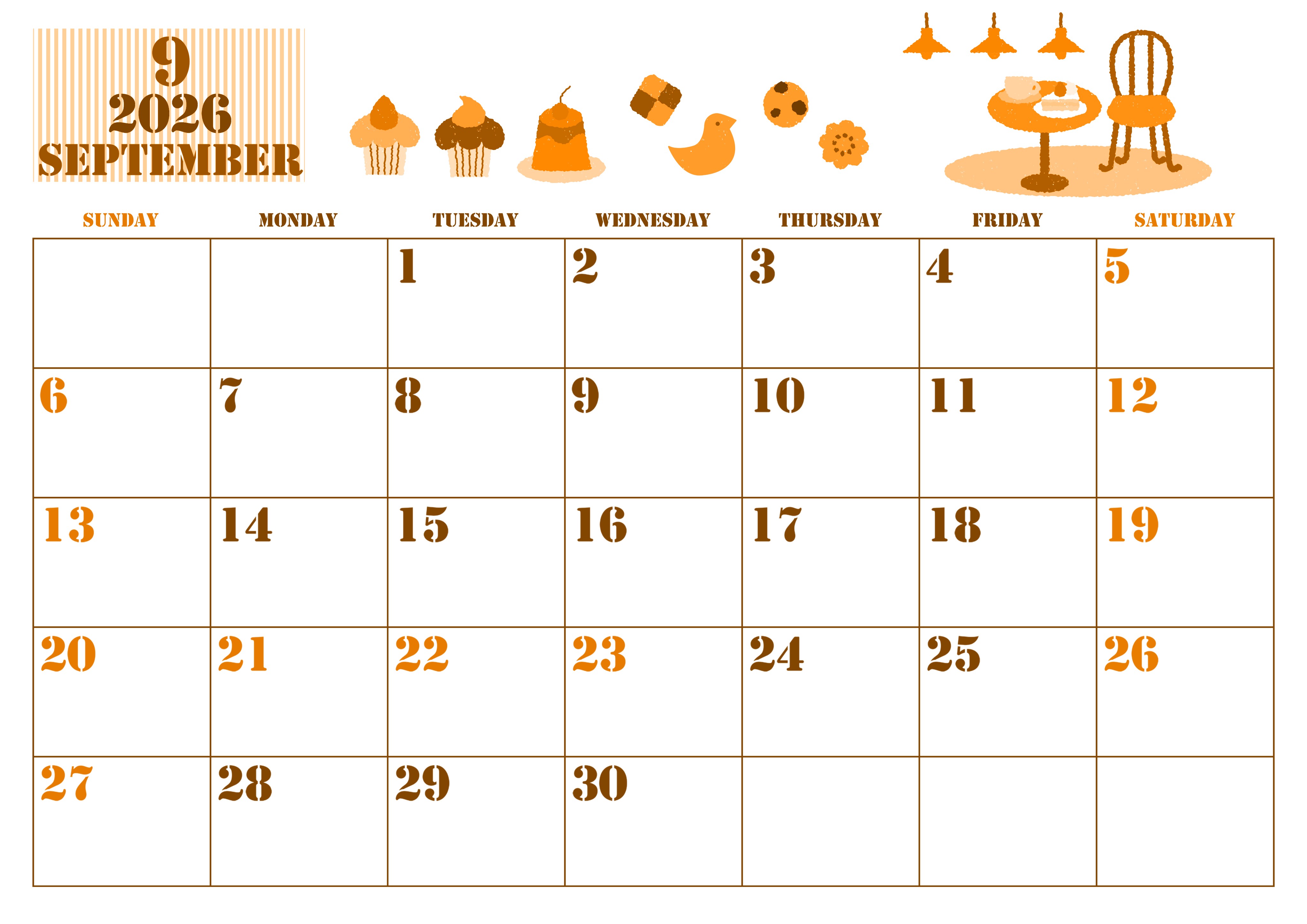 2026年9月横型日曜始まりの無料テンプレートオレンジのカレンダーです。食欲の秋を連想させるようなスイーツやカフェをテーマとしたイラストがガーリーでかわいい使いやすいオレンジのカレンダーを用意しました。(2026-01030900)