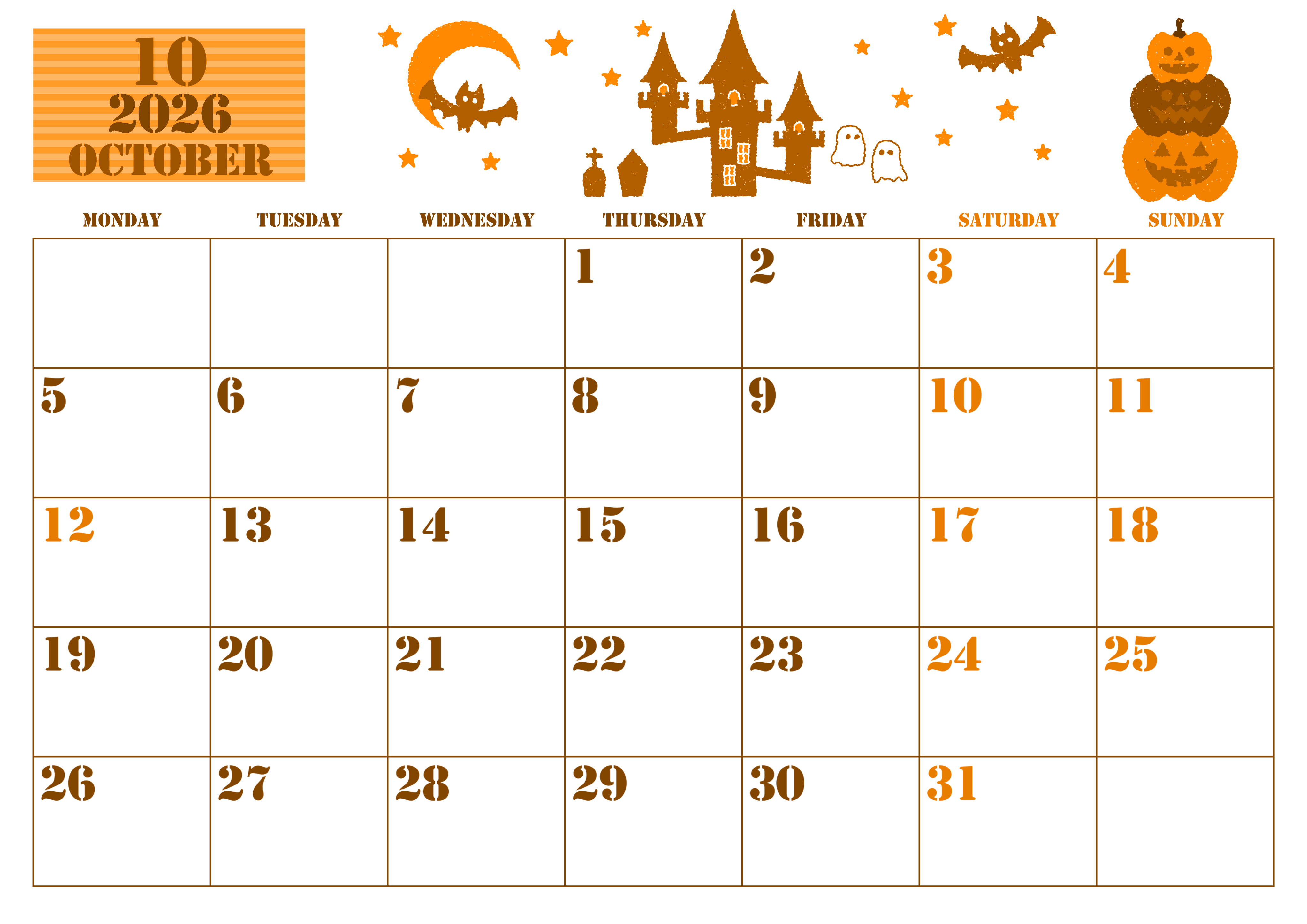 2026年10月横型月曜始まり ハロウィンイラストがかわいいA4無料オレンジのカレンダー(2026-01031001)