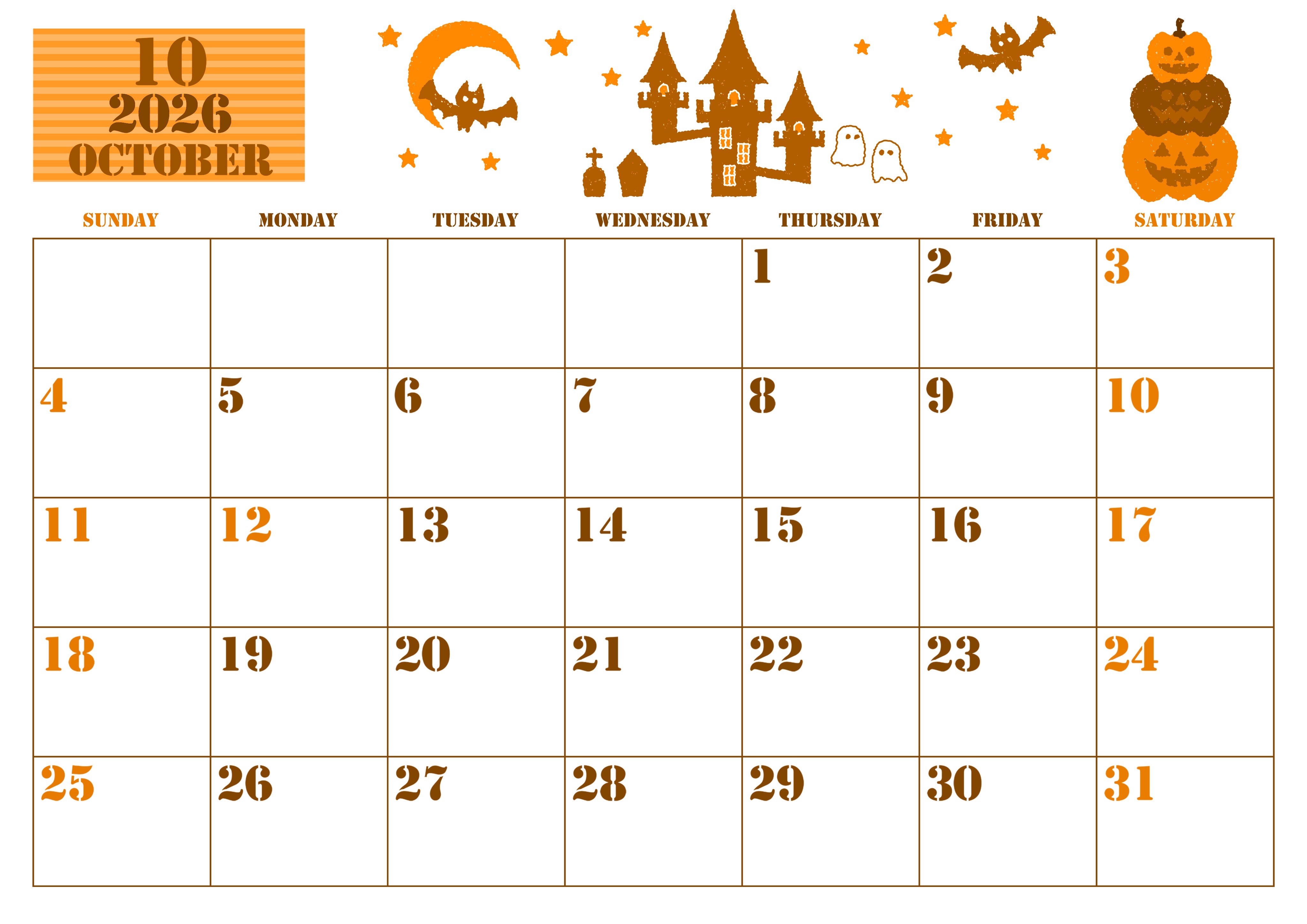 2026年・無料のカレンダーテンプレート 2026年10月横型日曜始まり ハロウィンイラストがかわいいA4無料オレンジのカレンダー(2026-01031000) 素材状デザイン王 2025年4月7日 2026年10月横型日曜始まりの無料テンプレートオレンジのカレンダーです。年月の背景部分がストライプでポップです。イラスト部分もハロウィン要素がたっぷりで非常にかわいいです。(2026-01031000) 10月 横型のカレンダー 日曜始まり オレンジ カレンダーデザイン-0103