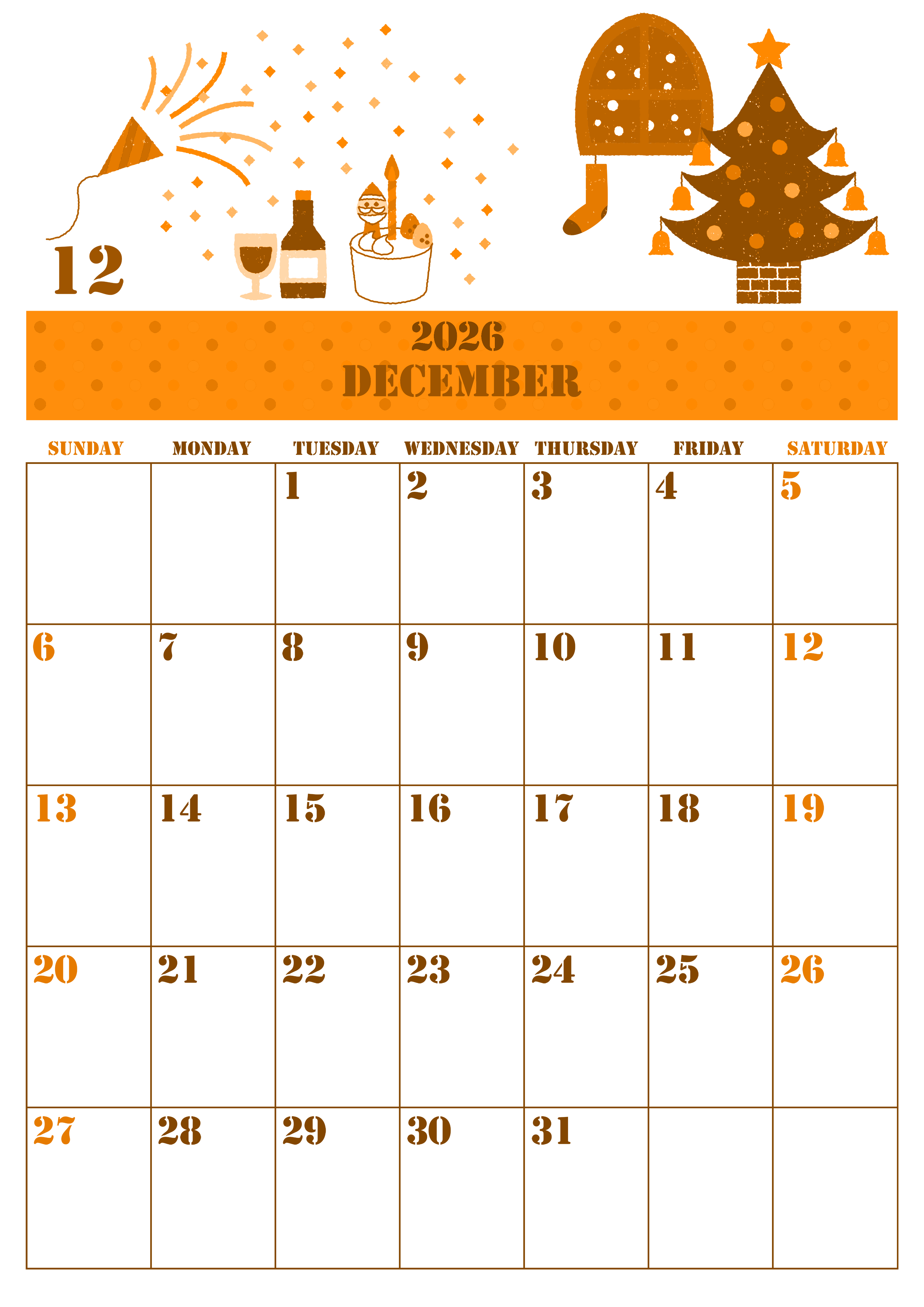 2026年12月縦型日曜始まりの無料テンプレートオレンジのカレンダーです。クリスマスツリーや靴下やクラッカーやワインといったパーティー要素がたっぷり詰まっているかわいいイラストとなっています。(2026-01031210)