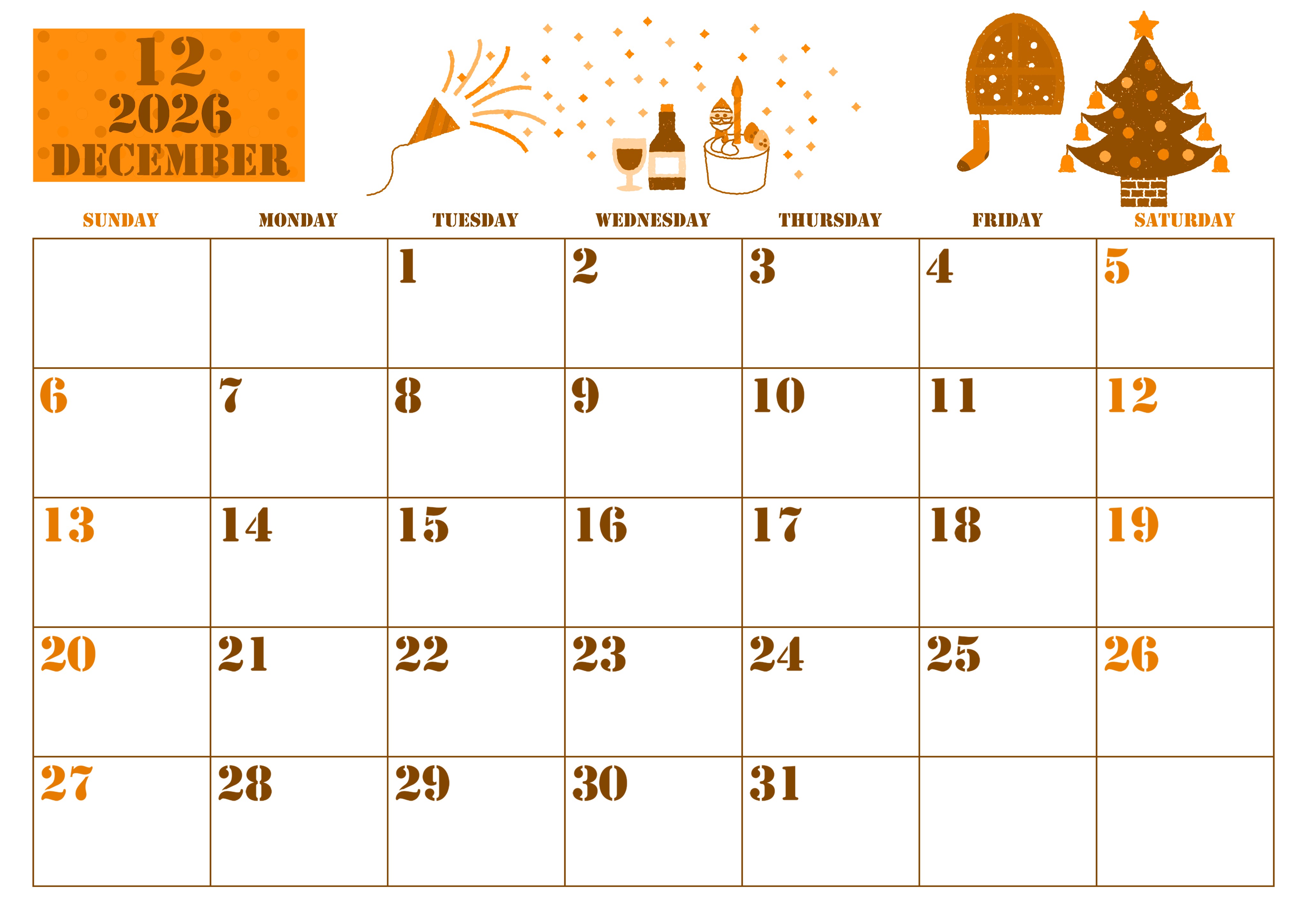 2026年12月横型日曜始まりの無料テンプレートオレンジのカレンダーです。クラッカーがパーンとはじけているパーティーの様子が描かれているかわいいイラストが予定を立てる側を楽しませてくれます。A4用紙にプリントアウトしましょう。(2026-01031200)