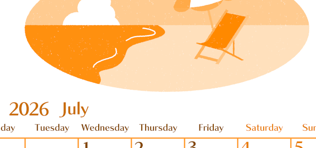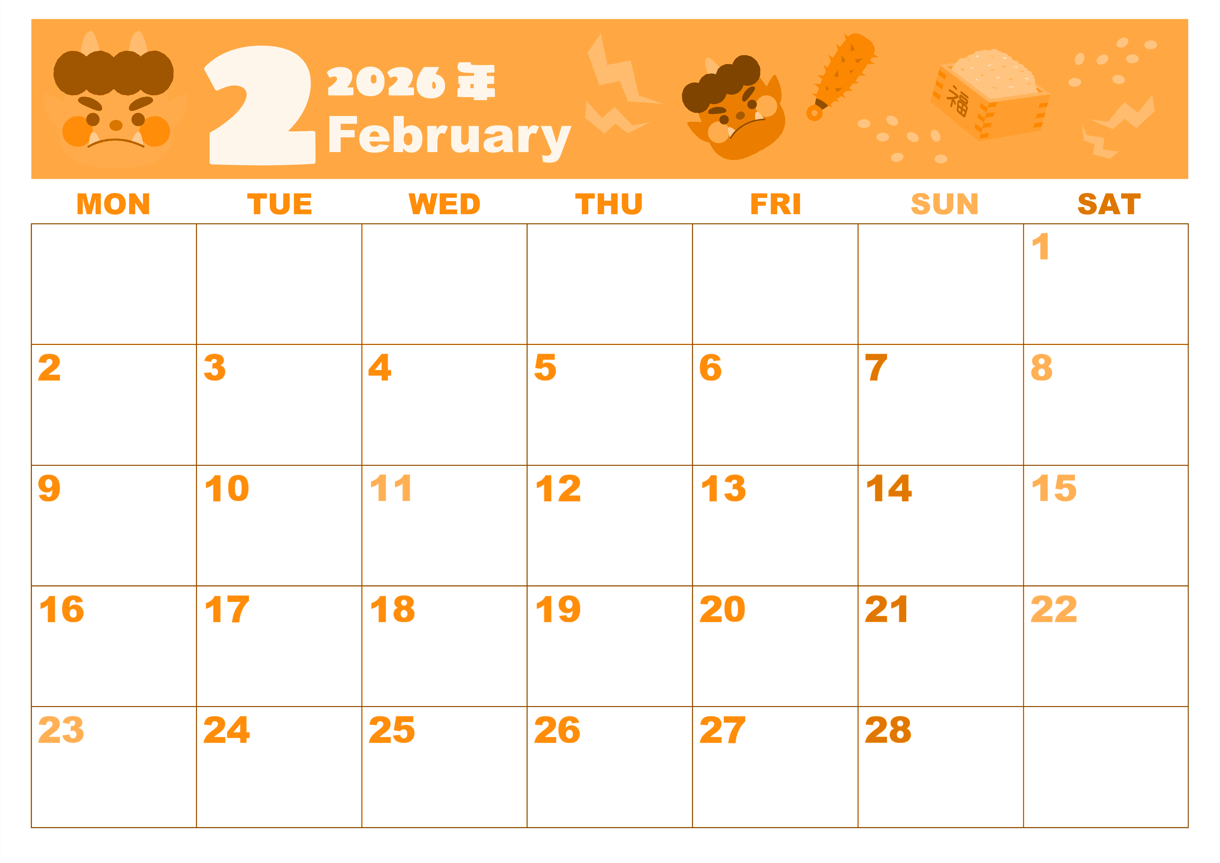 2026年2月横型月曜始まりの無料テンプレートオレンジのカレンダーです。節分の豆まきをモチーフにしたポップでかわいいイラストのオレンジのカレンダーです。横型で月曜始まりなのでプランニングに適したフォーマットの無料素材です。(2026-01040201)