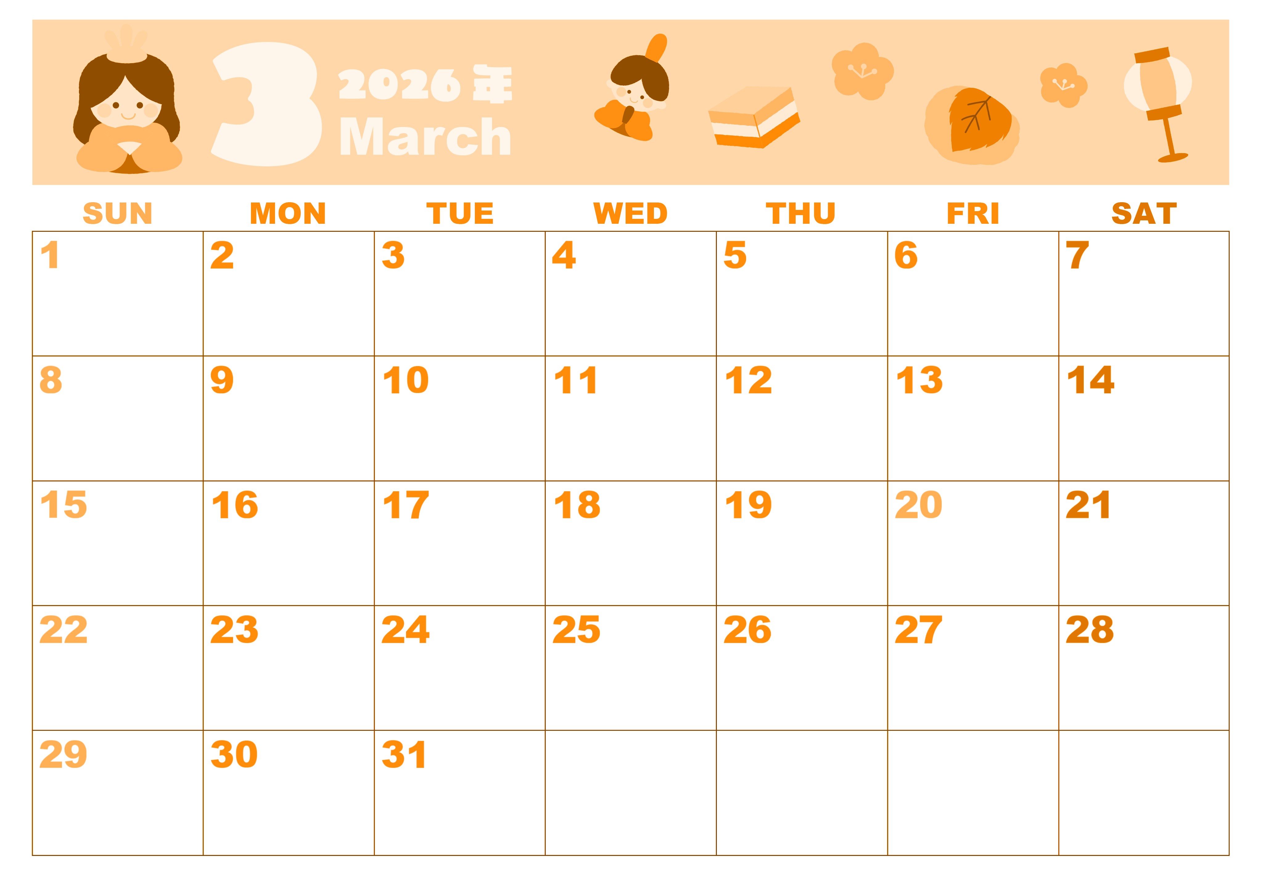 2026年・無料のカレンダーテンプレート 2026年3月横型日曜始まり ぼんぼりイラストのかわいいA4無料オレンジのカレンダー(2026-01040300) 素材状デザイン王 2025年4月7日 2026年3月横型日曜始まりの無料テンプレートオレンジのカレンダーです。柔らかい春の訪れを感じる丸みを帯びたかわいいイラストがたっぷりの無料オレンジのカレンダーです。(2026-01040300) 3月 横型のカレンダー 日曜始まり オレンジ カレンダーデザイン-0104