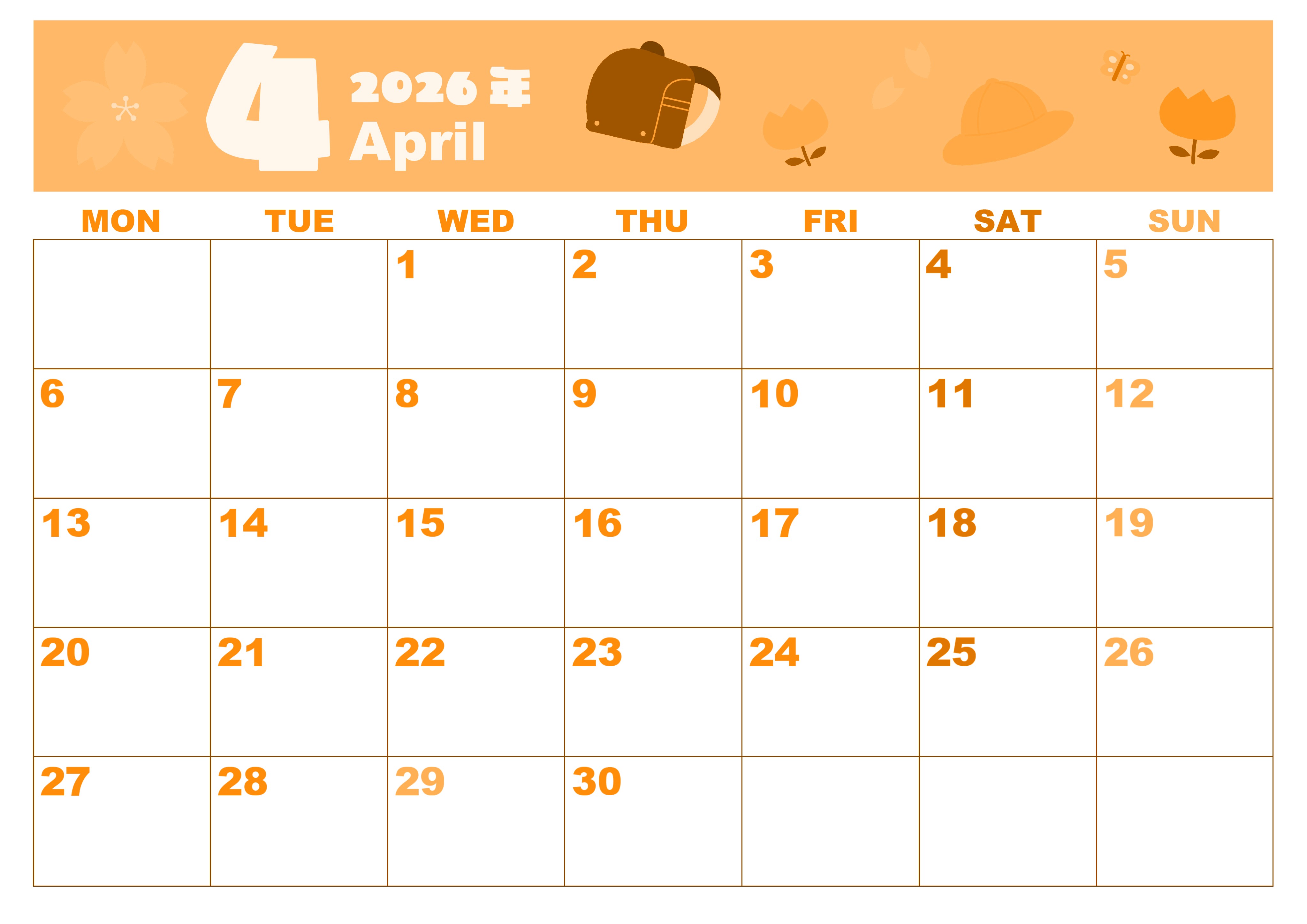 2026年4月横型月曜始まりの無料テンプレートオレンジのカレンダーです。月曜始まりなので予定を書き込みやすいオレンジのカレンダーです。ランドセルのイラストもかわいいので使うのが楽しくなるような無料素材です。(2026-01040401)