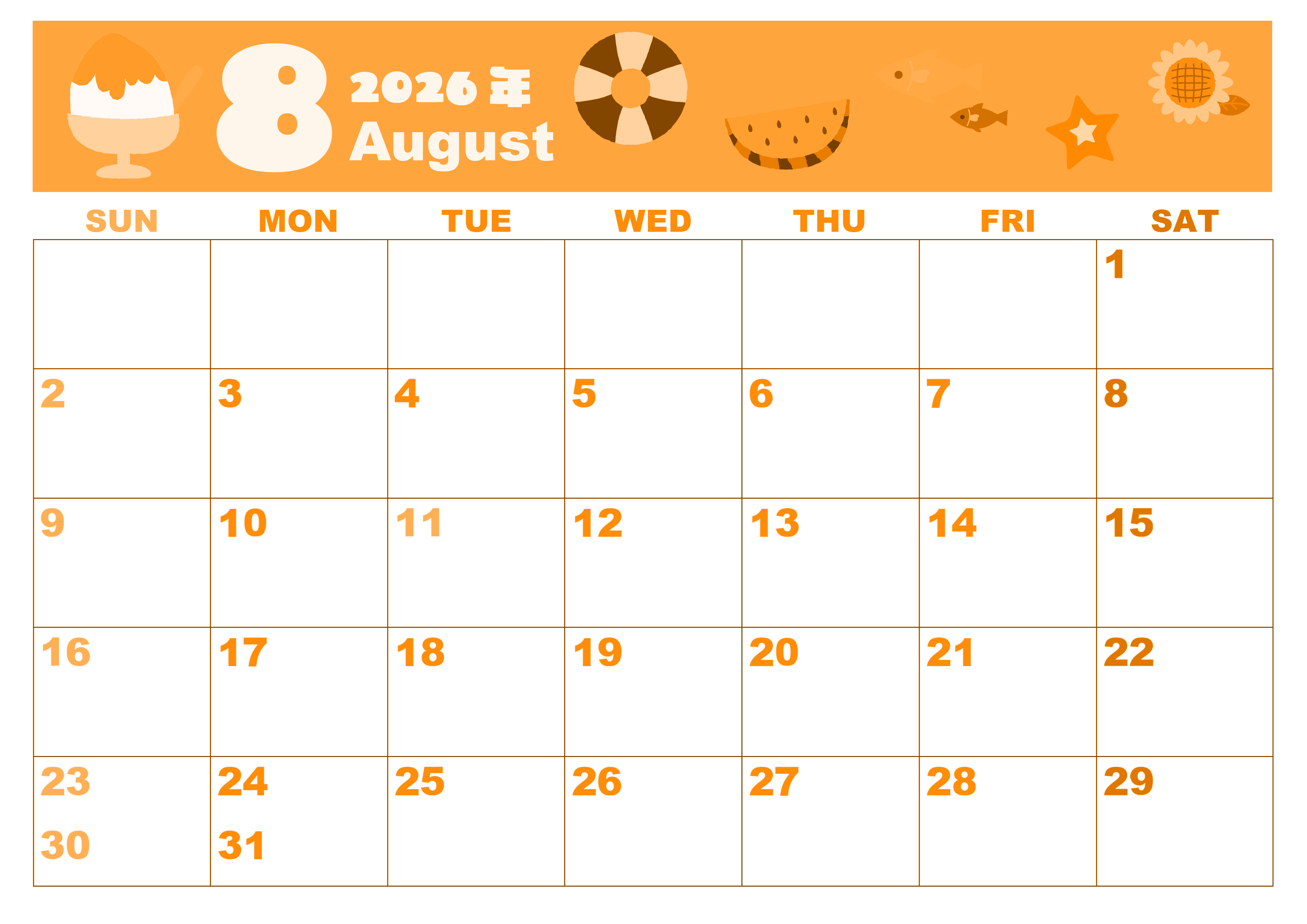 2026年8月横型日曜始まりの無料テンプレートオレンジのカレンダーです。ぽってりとした8月の文字が存在感があってかわいい夏休みをテーマにしたポップイラストオレンジのカレンダーです。A4サイズで無料にてお使い頂けます。(2026-01040800)
