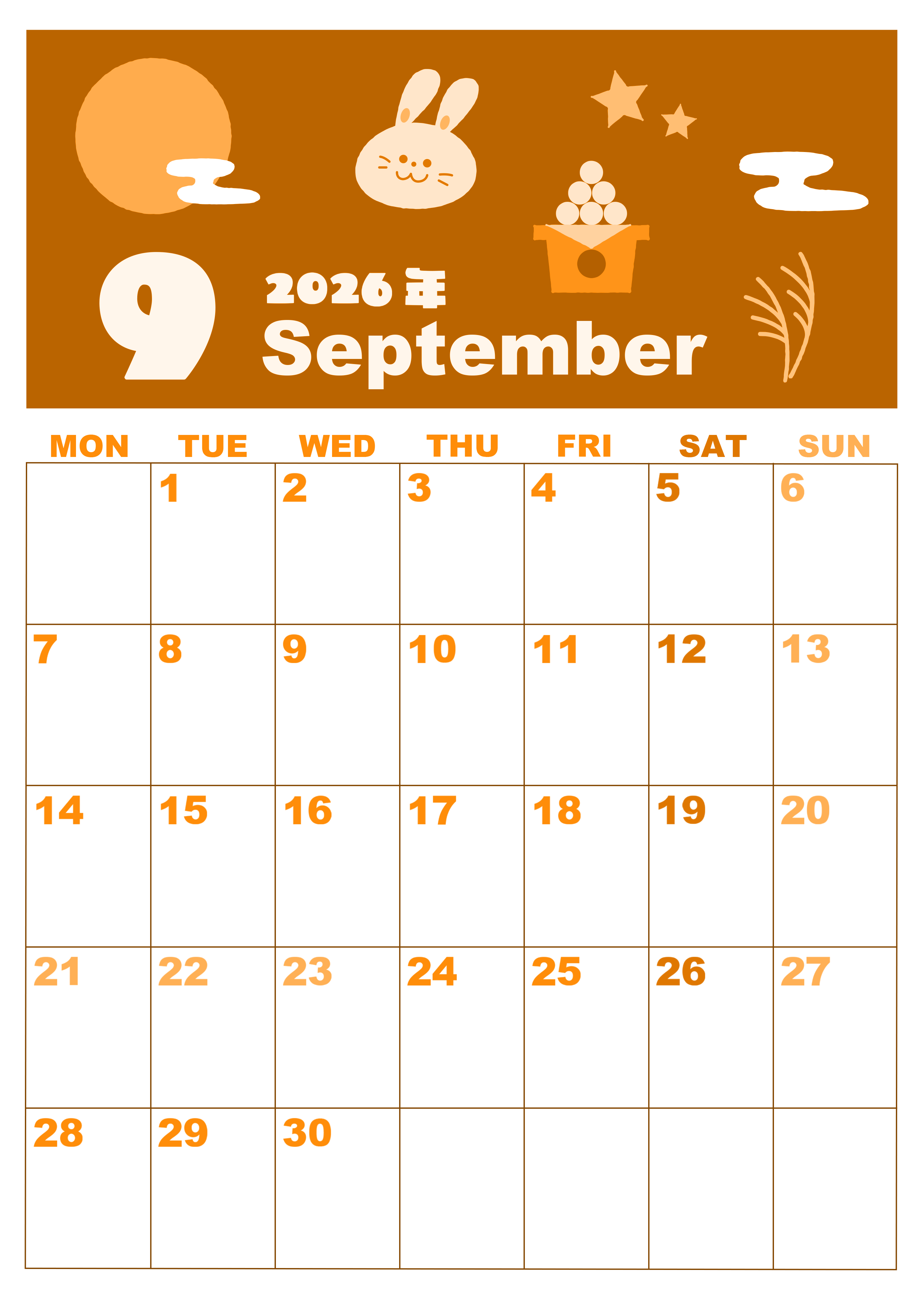 2026年9月縦型月曜始まりの無料テンプレートオレンジのカレンダーです。文字の色分けがされているので予定管理にとても向いています。お月見をテーマに取り上げたイラストもかわいいので使うモチベーションが上がります。(2026-01040911)