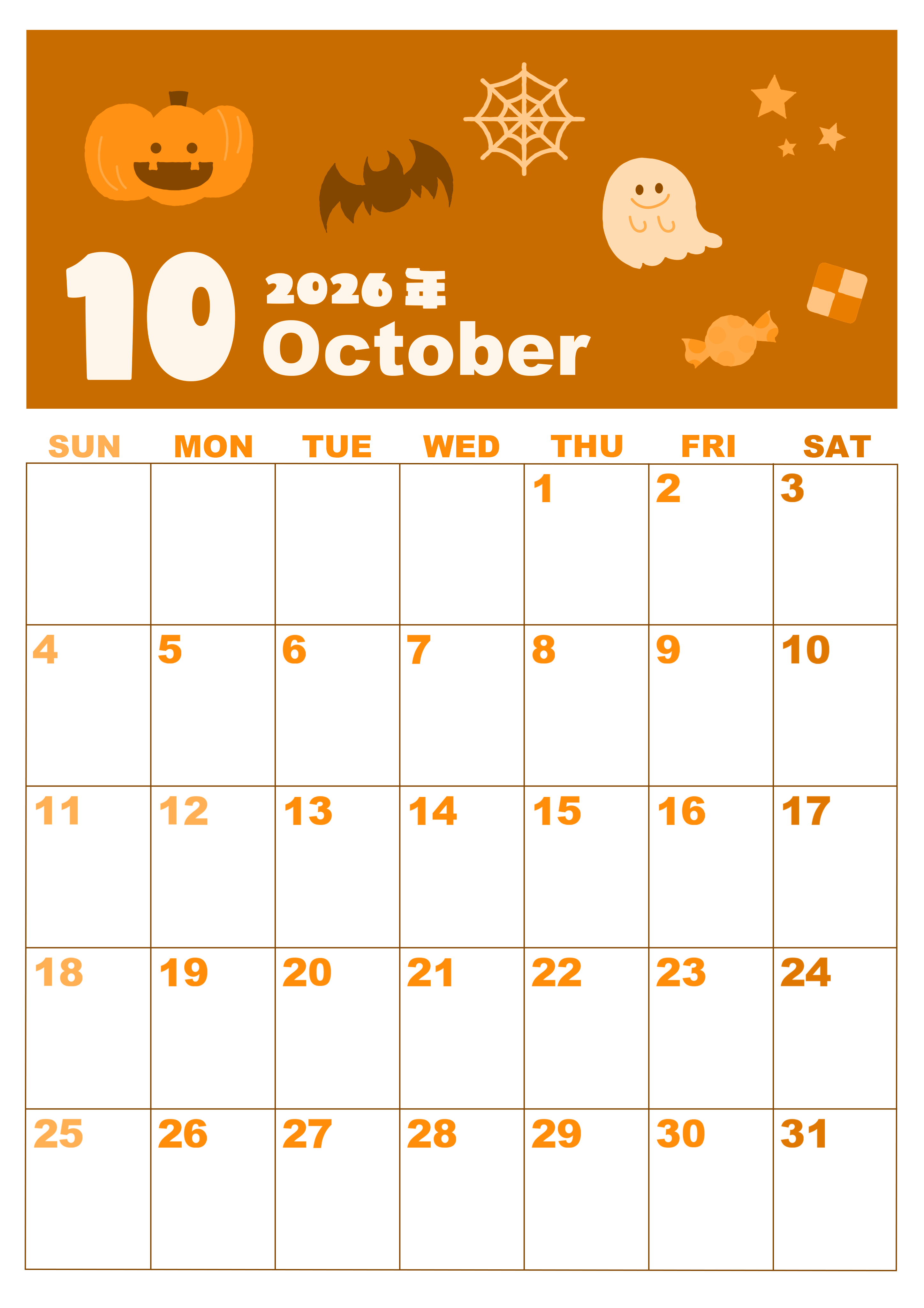 2026年・無料のカレンダーテンプレート 2026年10月縦型日曜始まり お菓子イラストのかわいいA4無料オレンジのカレンダー(2026-01041010) 素材状デザイン王 2025年4月7日 2026年10月縦型日曜始まりの無料テンプレートオレンジのカレンダーです。トリックオアトリート!お菓子をくれなきゃいたずらするぞ!ハロウィンをテーマにかわいいイラストを描き上げました。(2026-01041010) 10月 縦型のカレンダー 日曜始まり オレンジ カレンダーデザイン-0104