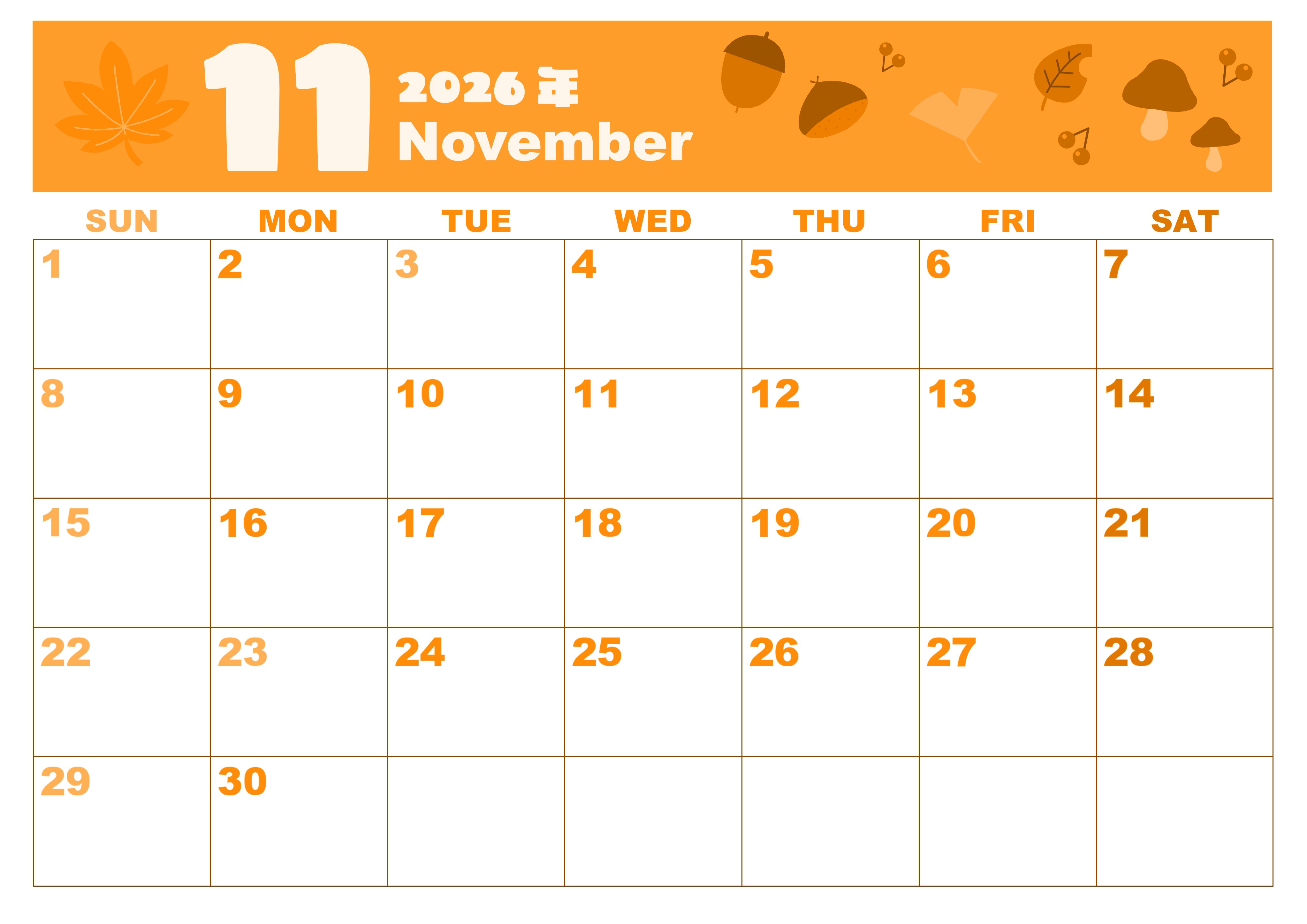 2026年11月横型日曜始まり どんぐりイラストのかわいいA4無料オレンジのカレンダー(2026-01041100)