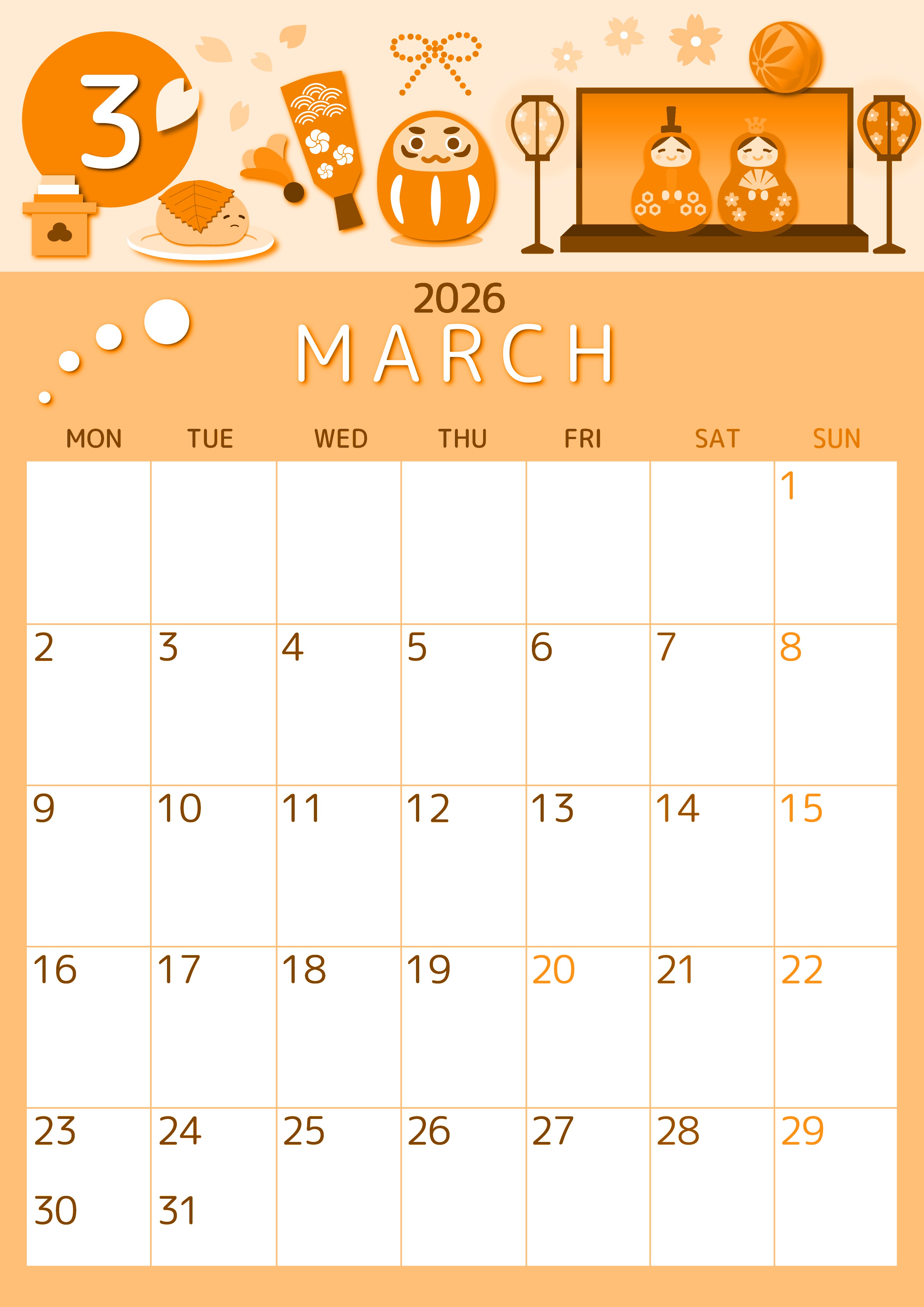 2026年・無料のカレンダーテンプレート 2026年3月縦型月曜始まり 桜花弁イラストのかわいいA4無料オレンジのカレンダー(2026-01050311) 素材状デザイン王 2025年4月7日 2026年3月縦型月曜始まりの無料テンプレートオレンジのカレンダーです。月曜始まりのオレンジのカレンダーしか使いたくないという人におすすめしたいシンプルでかわいいイラストテンプレートです。(2026-01050311) 3月 縦型のカレンダー 月曜始まり オレンジ カレンダーデザイン-0105