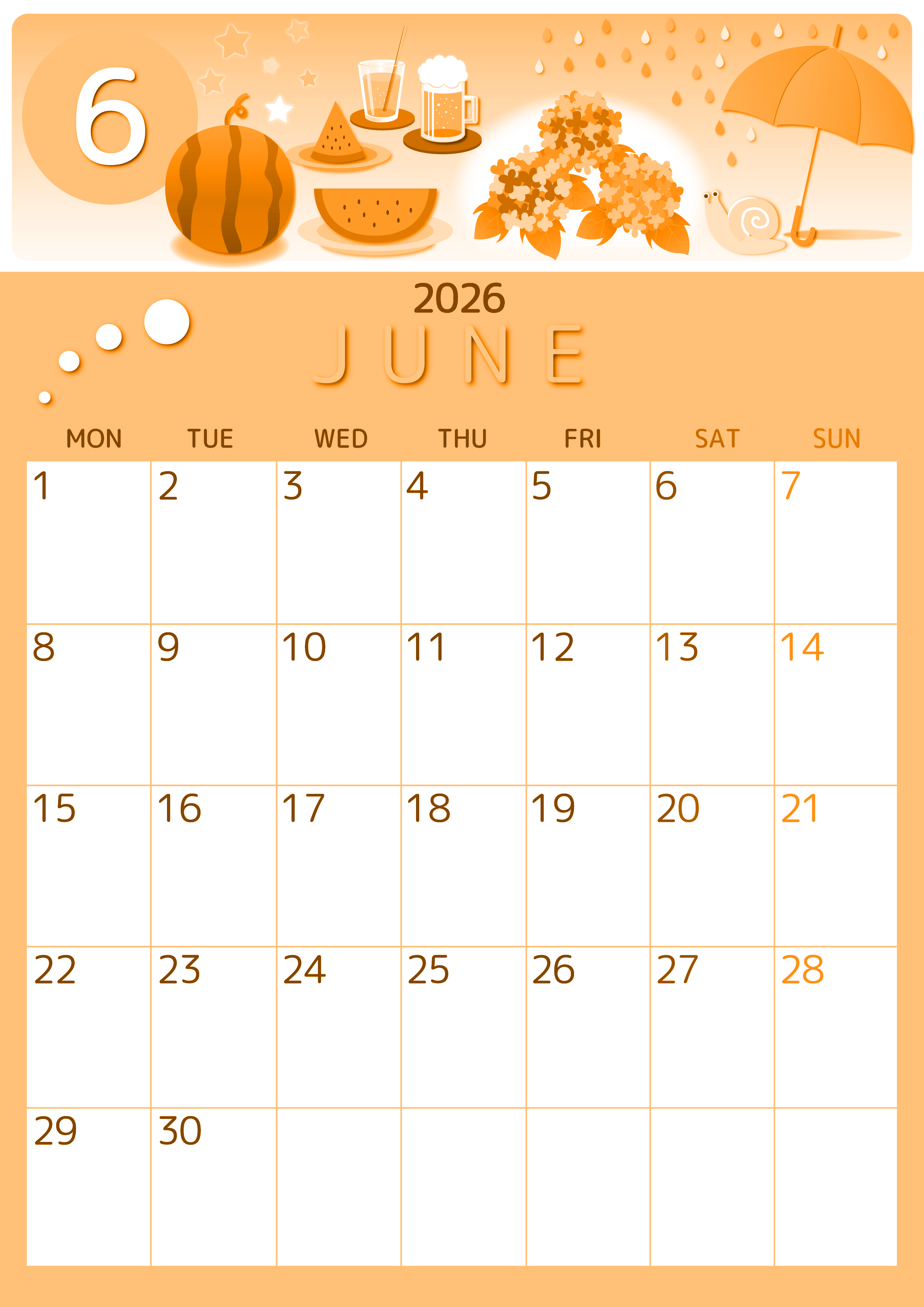 2026年6月縦型月曜始まりの無料テンプレートオレンジのカレンダーです。黄色のフレームに囲まれていてスケジュールを記入する欄は白くて使いやすい月曜始まりのオレンジのカレンダーです。イラストもすいかがかわいい夏らしい素材です。(2026-01050611)