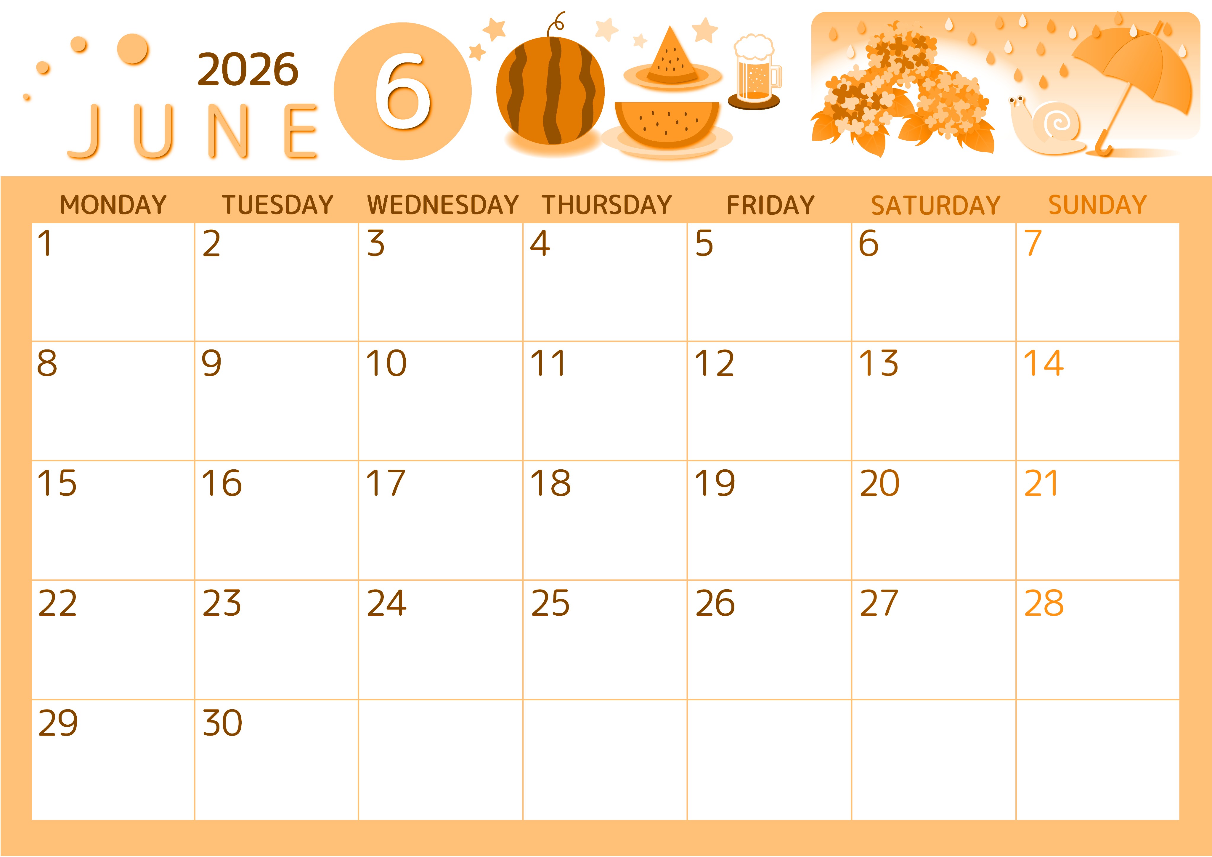 2026年6月横型月曜始まりの無料テンプレートオレンジのカレンダーです。月曜始まりでA4サイズのオレンジのカレンダーです。すいかと梅雨をモチーフにしたイラストがかわいいのでスケジュールを立てるのが楽しくなります。(2026-01050601)