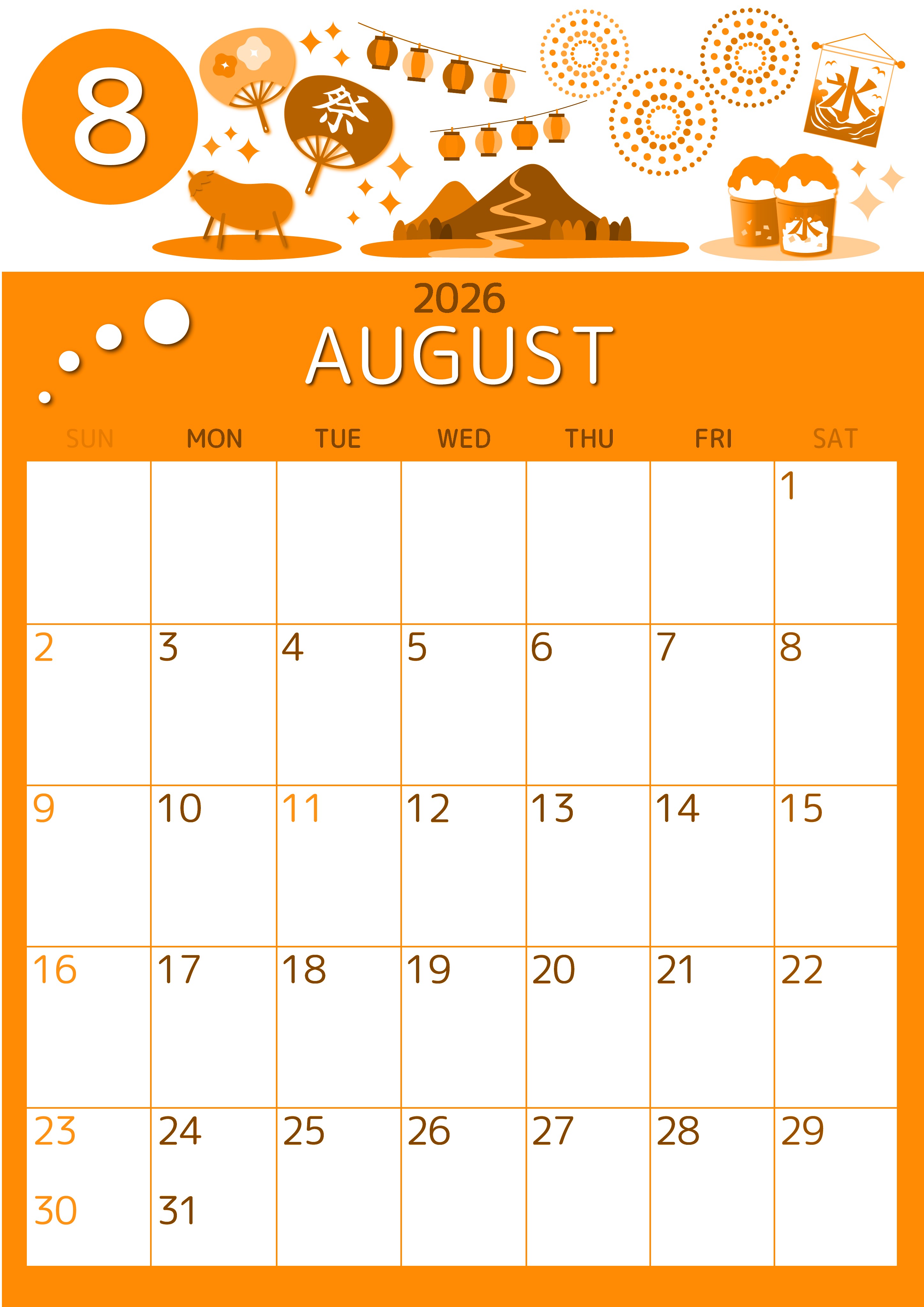 2026年8月縦型日曜始まり 夏祭りイラストのかわいいA4無料オレンジのカレンダー(2026-01050810)