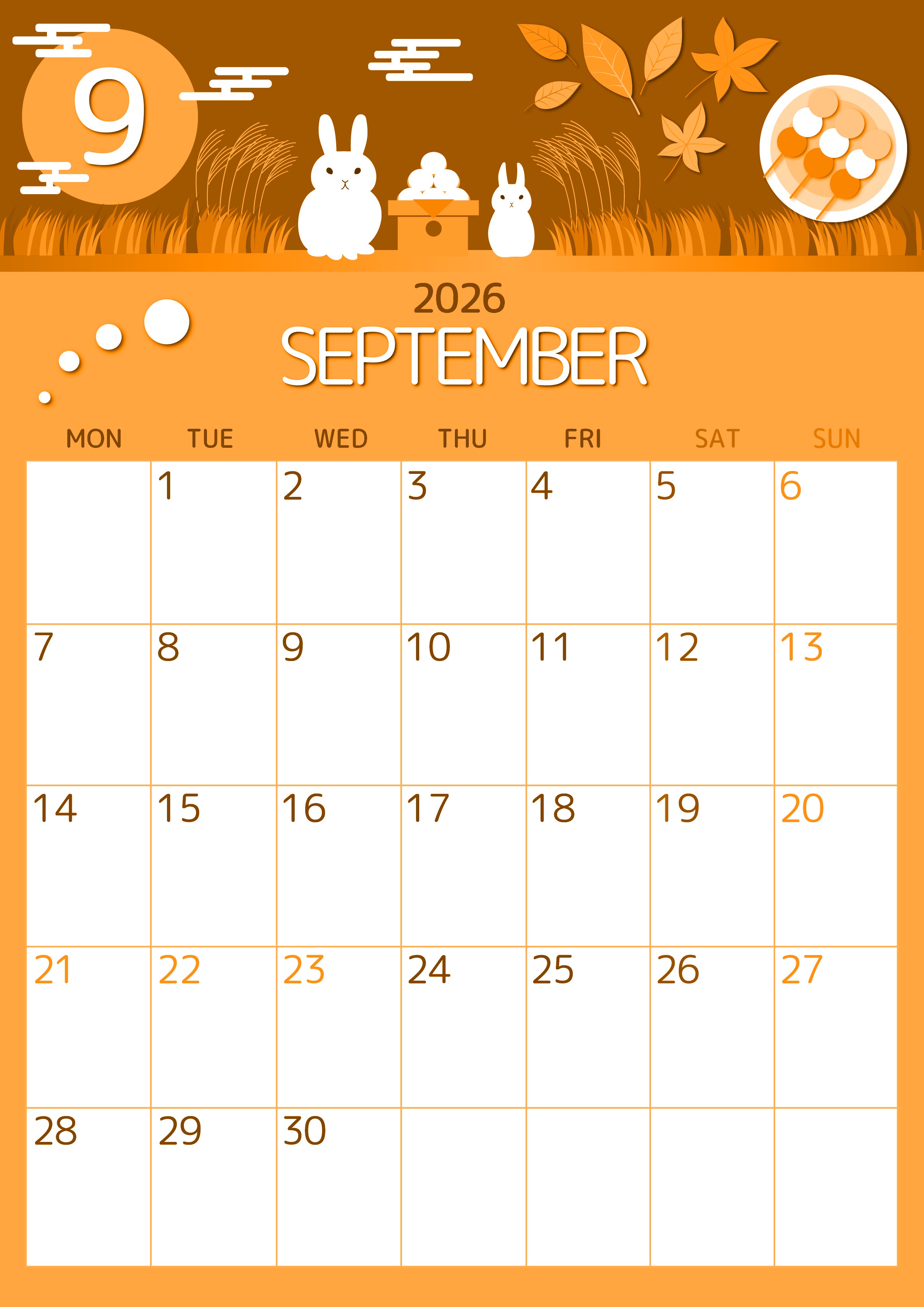 2026年9月縦型月曜始まりの無料テンプレートオレンジのカレンダーです。十五夜のイラストが賑やかで秋の肌寒さを吹き飛ばしてくれるような雰囲気です。かわいいだけでなく月曜始まりで計画を立てやすいです。(2026-01050911)