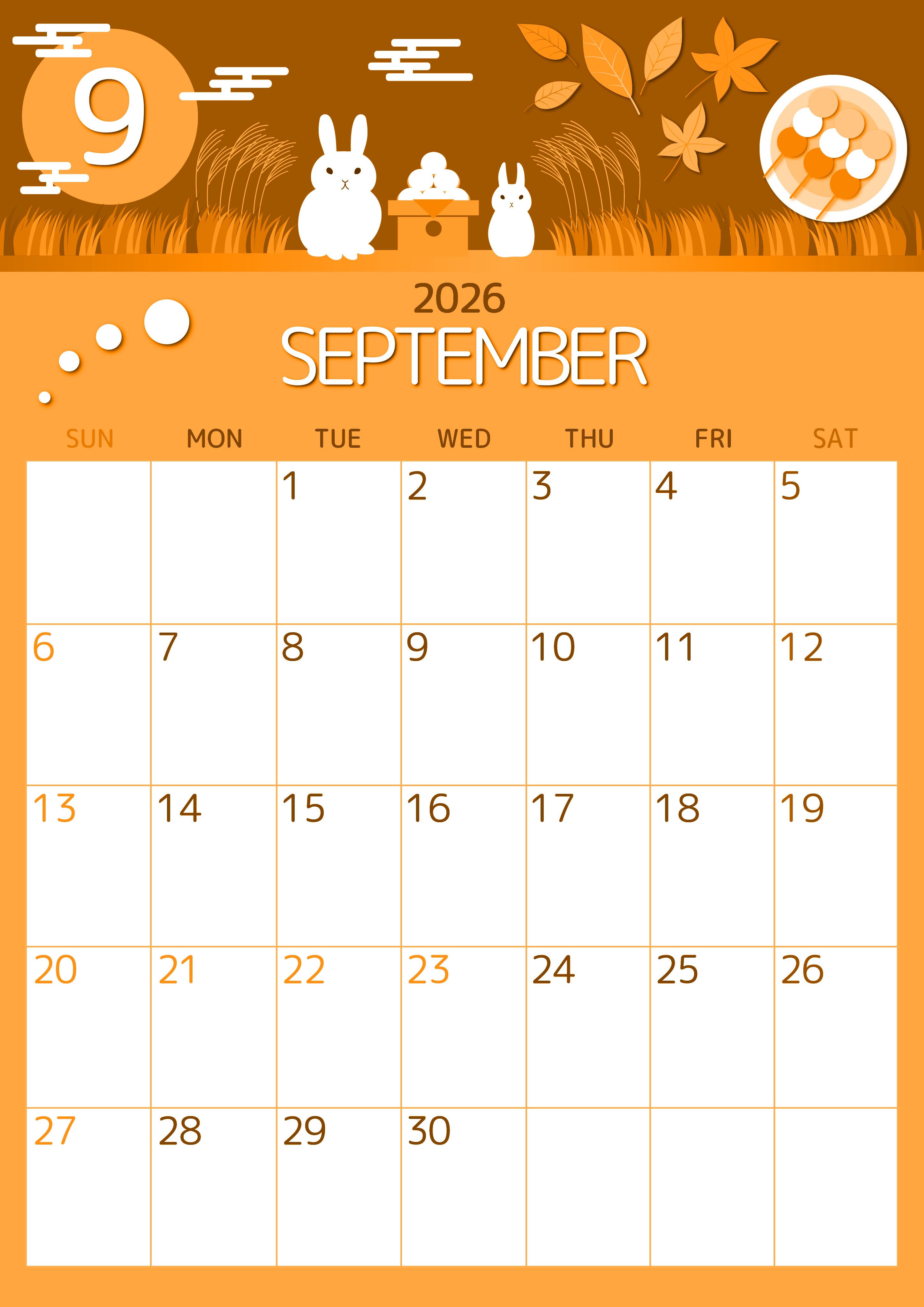 2026年・無料のカレンダーテンプレート 2026年9月縦型日曜始まり 十五夜イラストのかわいいA4無料オレンジのカレンダー(2026-01050910) 素材状デザイン王 2025年4月7日 2026年9月縦型日曜始まりの無料テンプレートオレンジのカレンダーです。文字が細いフォントなのでスッキリとして見やすいデザインです。イラスト部分は十五夜を題材にしていてかわいいポップな調子です。(2026-01050910) 9月 縦型のカレンダー 日曜始まり オレンジ カレンダーデザイン-0105