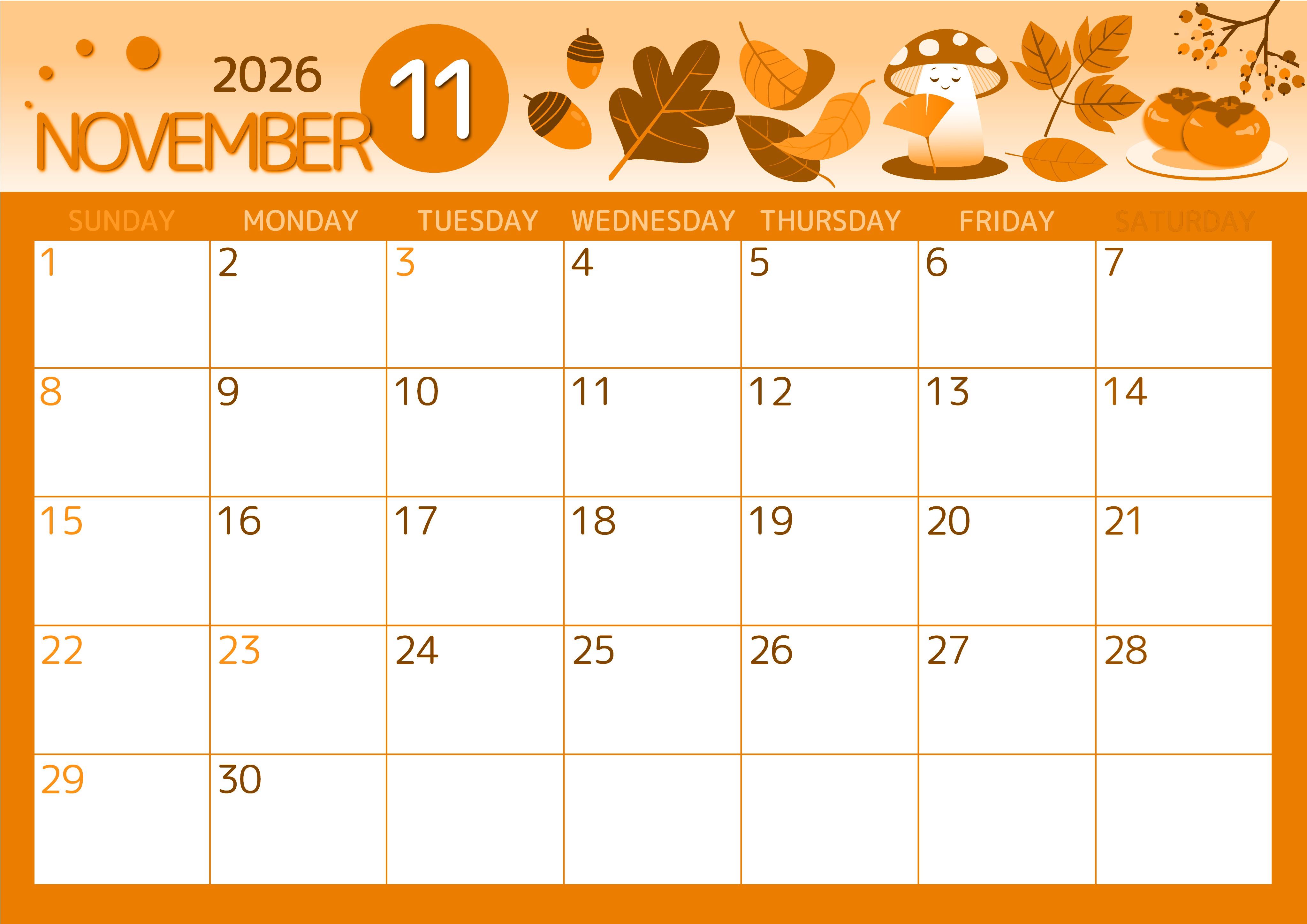 2026年11月横型日曜始まりの無料テンプレートオレンジのカレンダーです。キノコが主役のイラストがかわいいです。オレンジのカレンダーのフレーム部分はワインレッドでしっかり囲まれているのでシックさもあります。(2026-01051100)