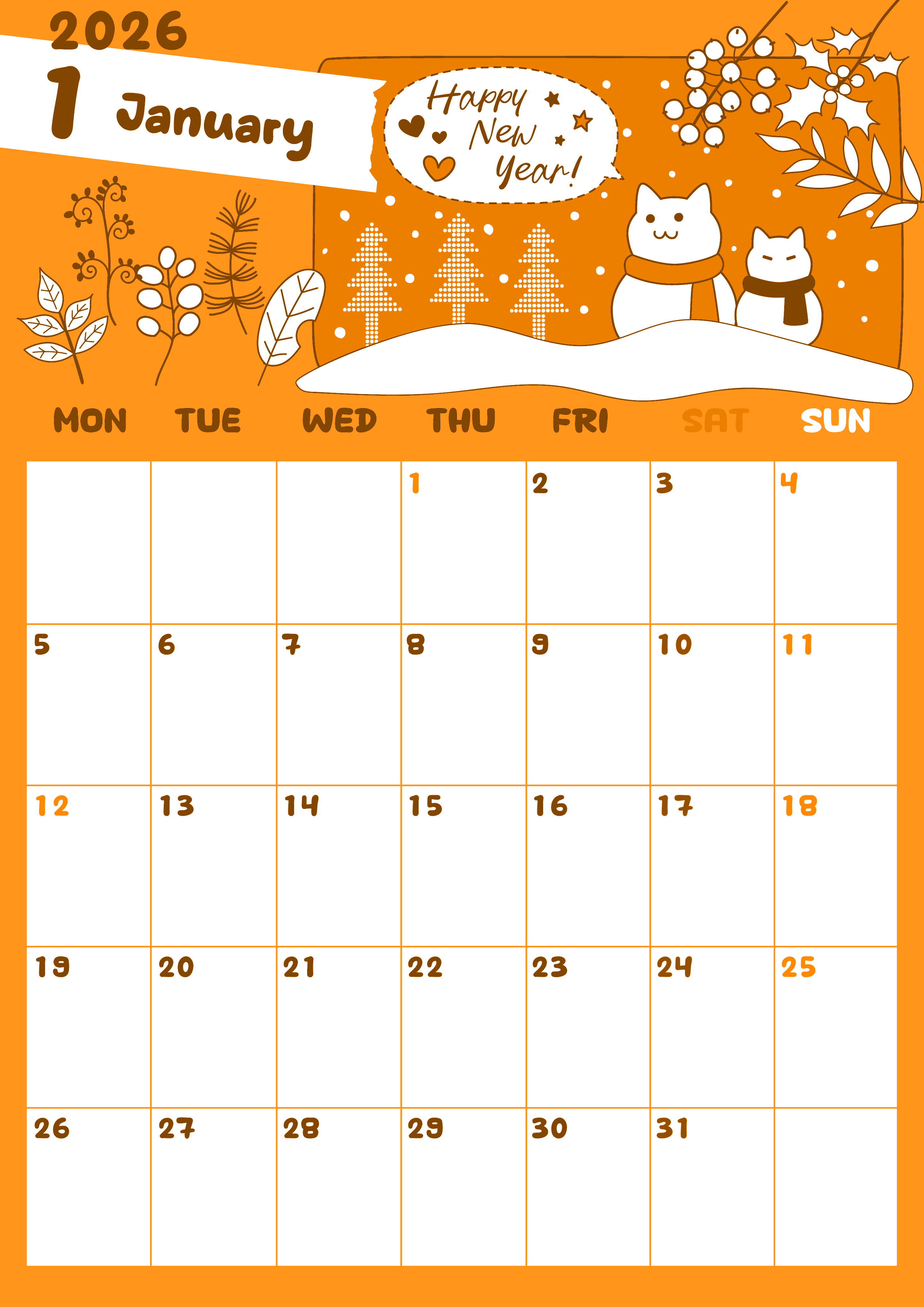 2026年1月縦型月曜始まりです。全体的にエネルギッシュな色合いのポップなイラストが特徴のオレンジのカレンダーです。猫のカタチをした雪だるまが新年の挨拶をしているのもとってもかわいいフリー素材です。(2026-01060111)