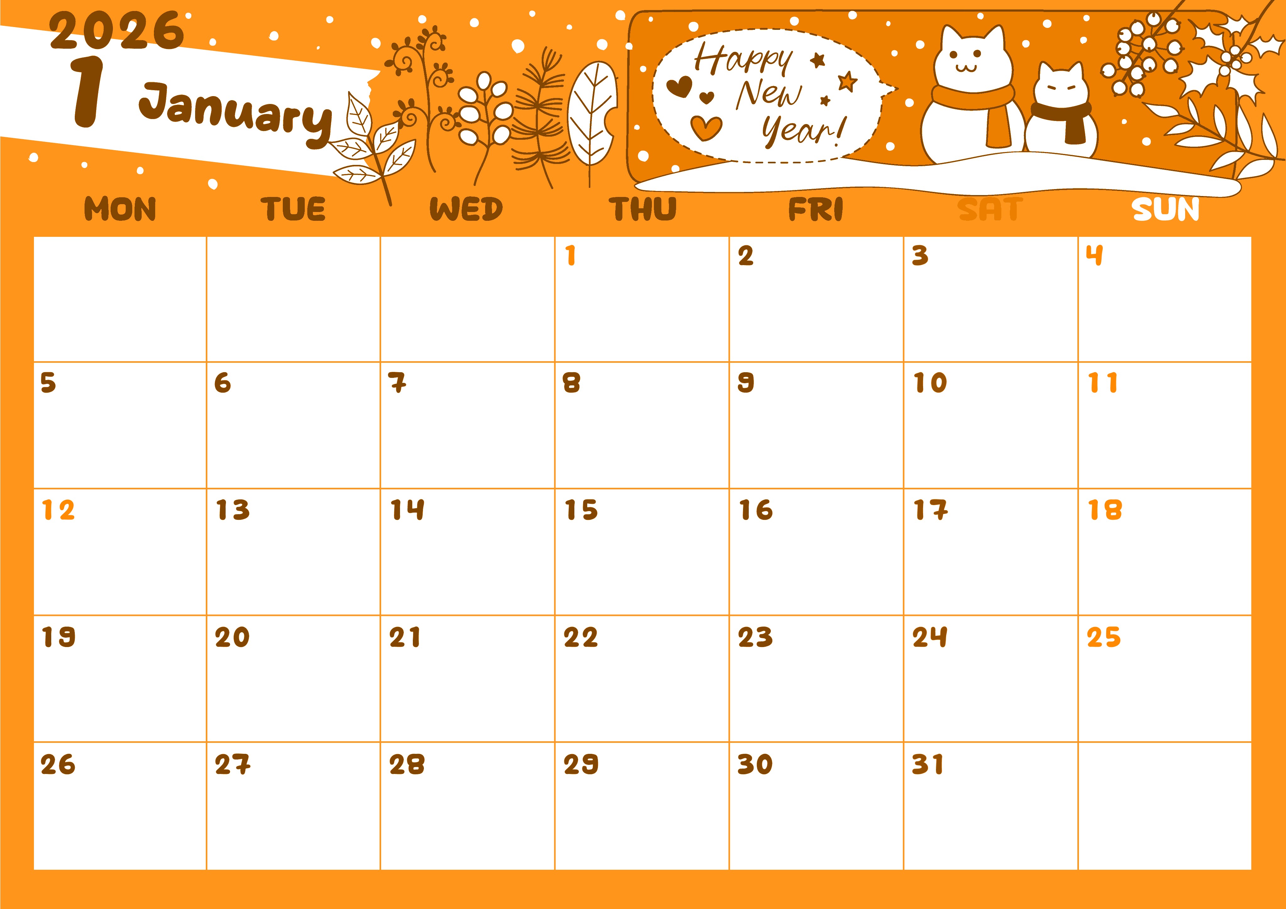 2026年1月横型月曜始まりです。ボタニカルなリーフがモノトーンでオレンジのカレンダー上部中央にあり、その右側には寄り添ったネコ型雪だるまが2体ちょこんと座っているようなかわいいオリジナルオレンジのカレンダーです。ユニークなフリー素材です。(2026-01060101)