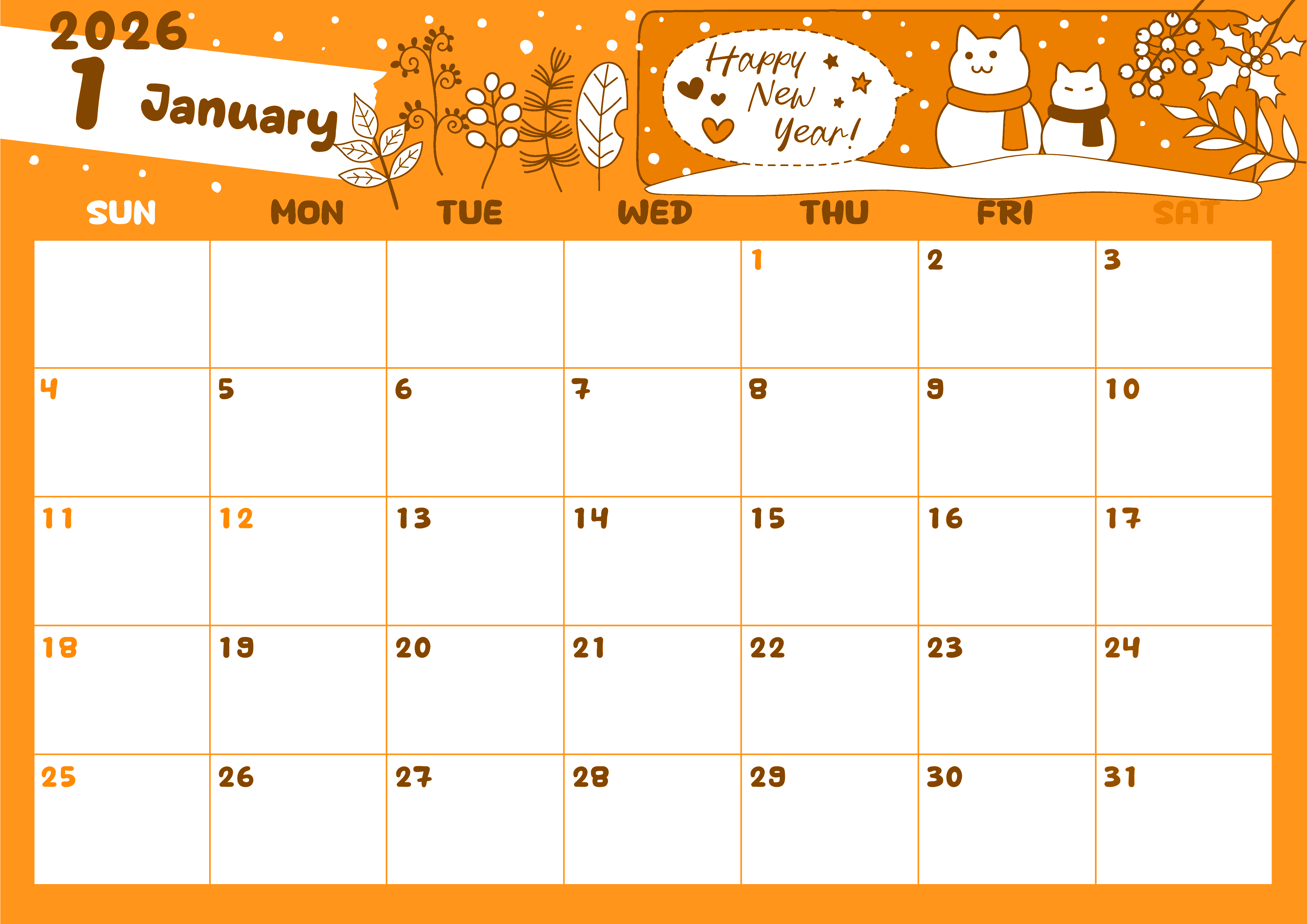 2026年1月横型日曜始まりです。ボタニカルな草花がモノトーンで描かれている一方、枠部分の背景はビビッドなイエローとコントラストがはっきりとしたかわいい背景のオリジナルオレンジのカレンダーです。猫耳の雪だるまカップルがかわいいのがポイントです。(2026-01060100)