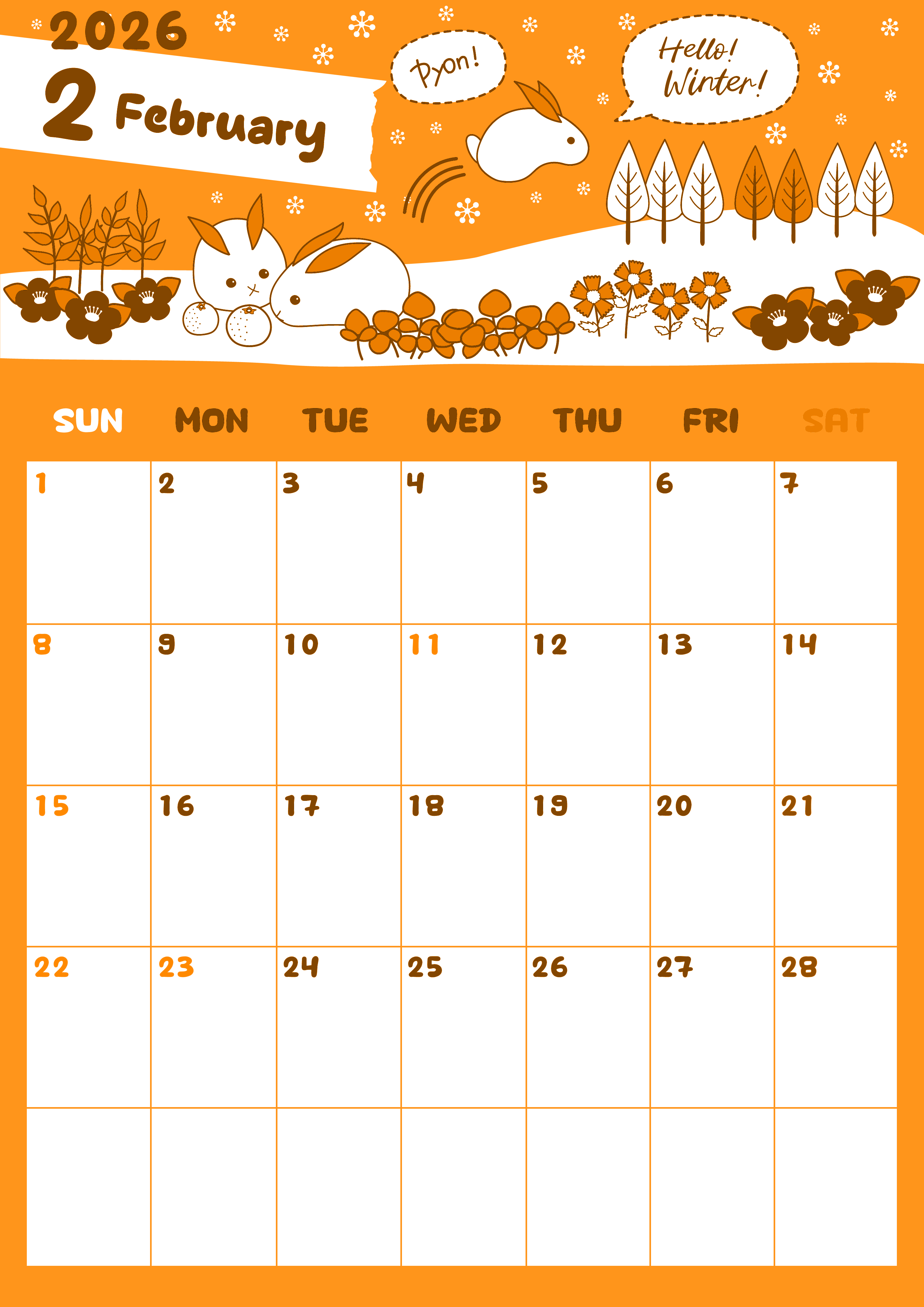 2026年2月縦型日曜始まりの無料テンプレートオレンジのカレンダーです。独特の世界観が使う人の飽きを感じさせないような賑やかでポップでかわいいイラストオレンジのカレンダーです。ポジティブにさせてくれます。(2026-01060210)