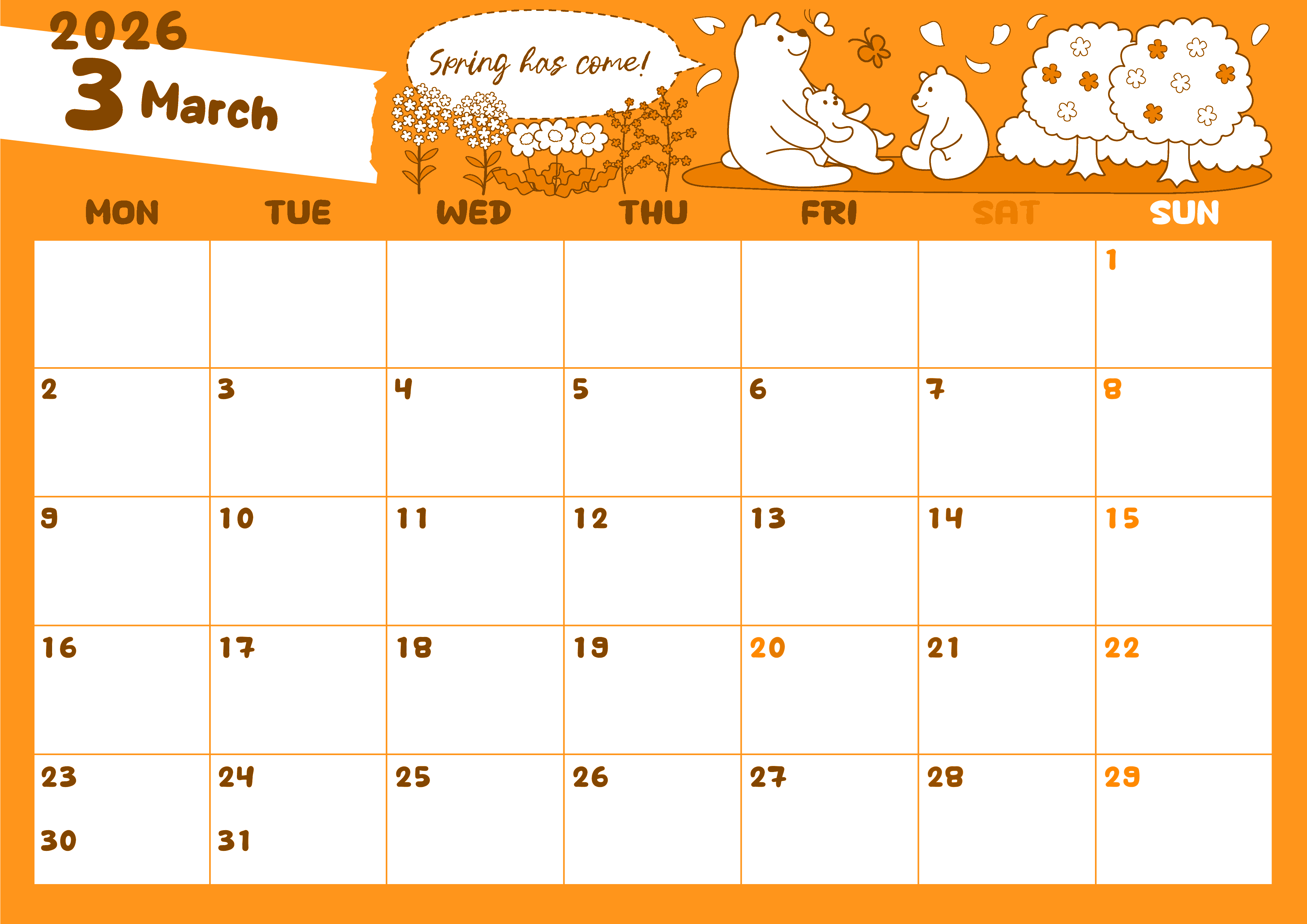 2026年3月横型月曜始まりの無料テンプレートオレンジのカレンダーです。白熊の友達たちが日向ぼっこをしているほのぼのとしているポップでかわいいイラストオレンジのカレンダーです。月曜始まりで仕事や勉強のスケジュールチェックに適しています。(2026-01060301)