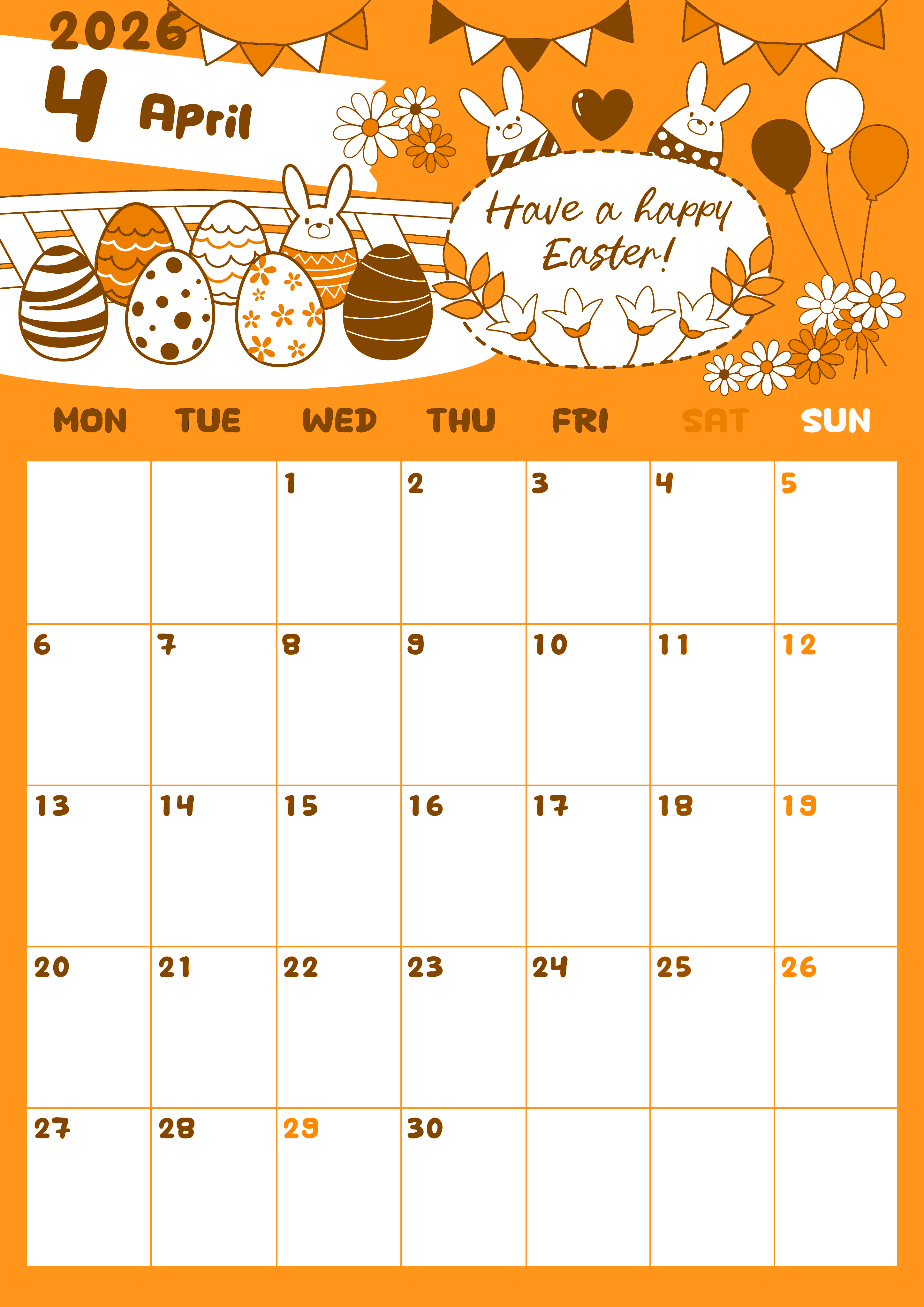 2026年4月縦型月曜始まりの無料テンプレートオレンジのカレンダーです。イースターエッグとフラッグといったフェスティバル感が満載のイラストがかわいいオレンジのカレンダー素材です。ダウンロードは無料にて行えて便利です。(2026-01060411)