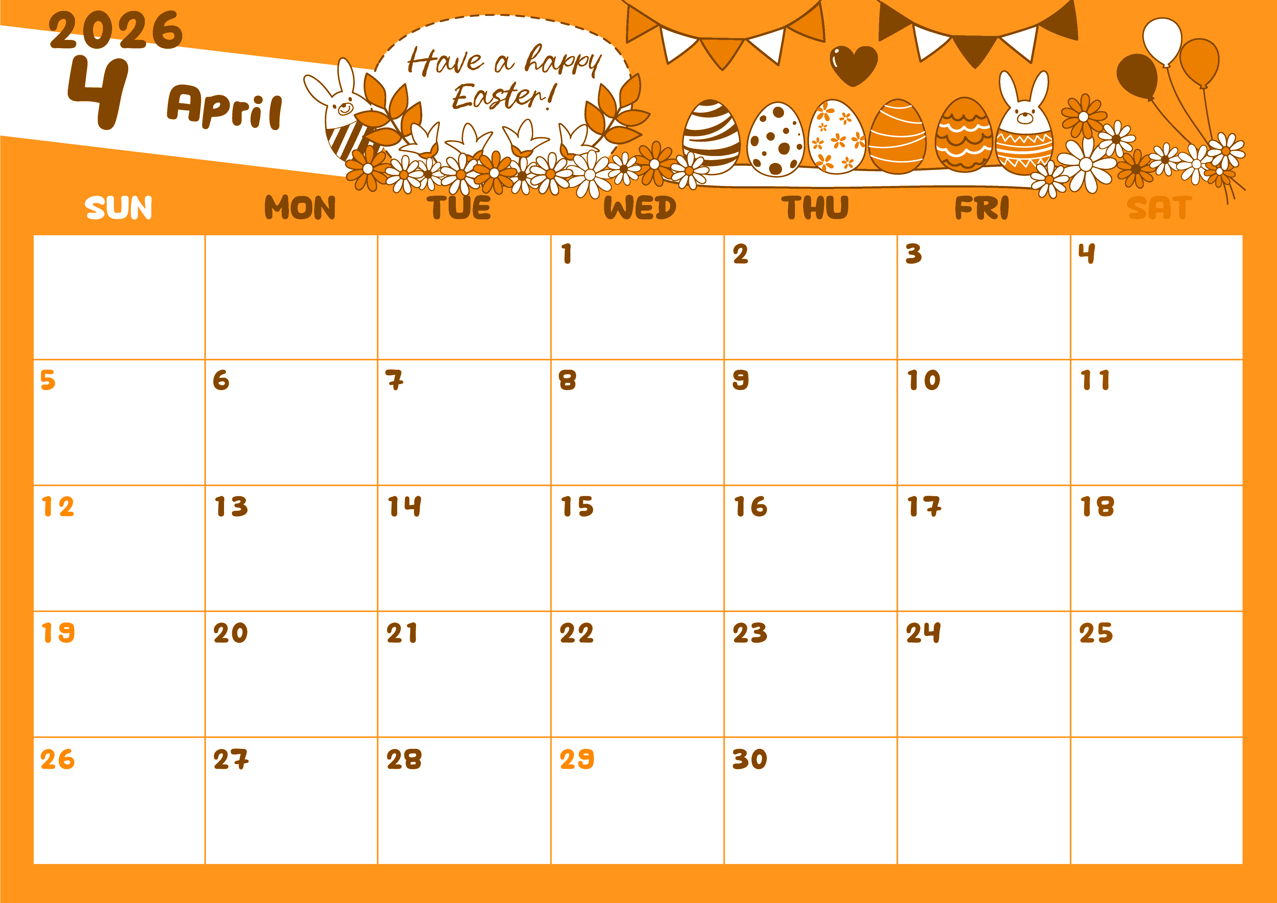 2026年4月横型日曜始まり イースターエッグイラストのかわいいA4無料オレンジのカレンダー(2026-01060400)