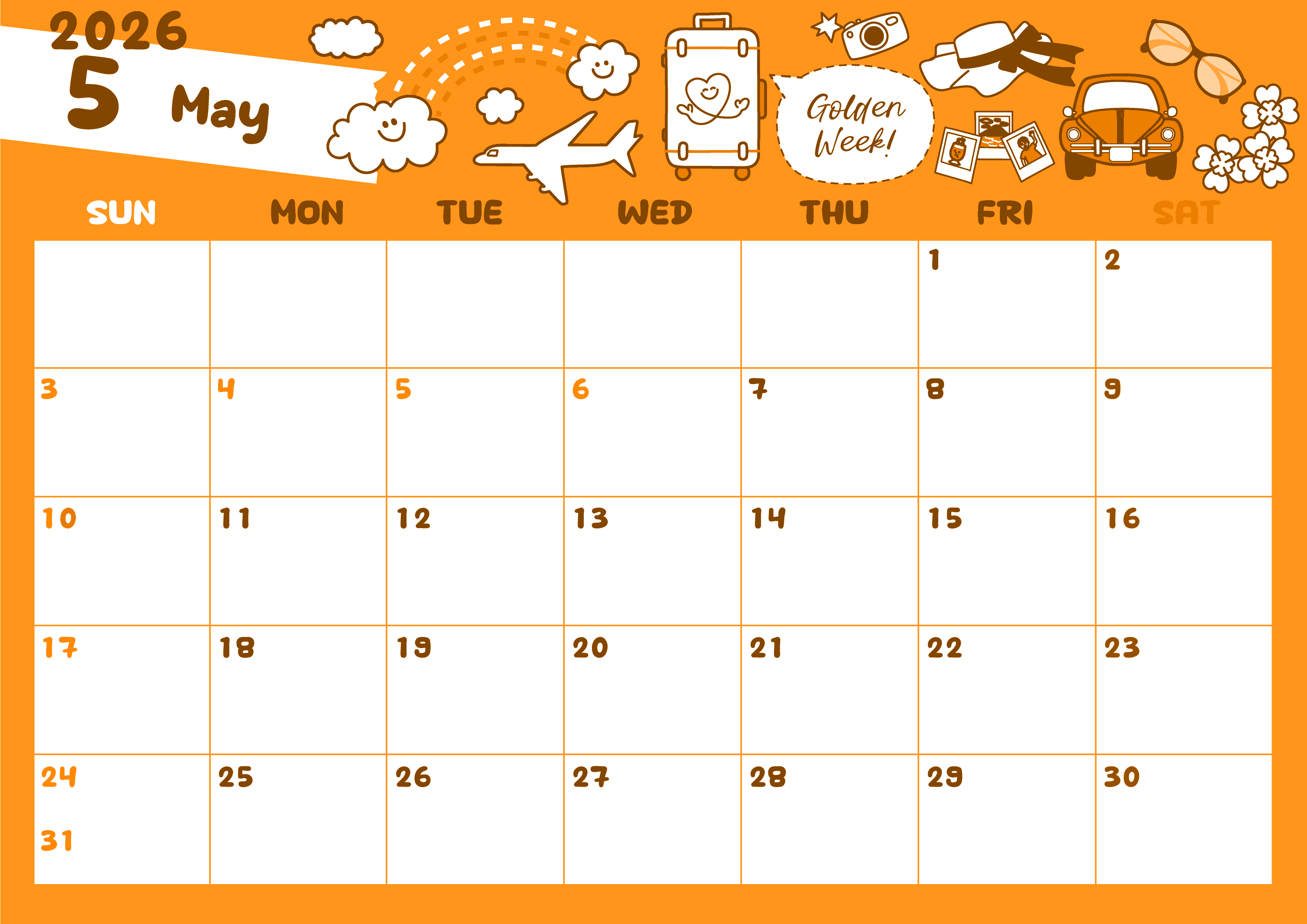 2026年5月横型日曜始まりの無料テンプレートオレンジのカレンダーです。GWといえば飛行機や車に乗って国内旅行や海外旅行を楽しむ人も少なくありません。旅行の楽しさが伝わってくるポップでかわいいイラストのオレンジのカレンダーです。(2026-01060500)