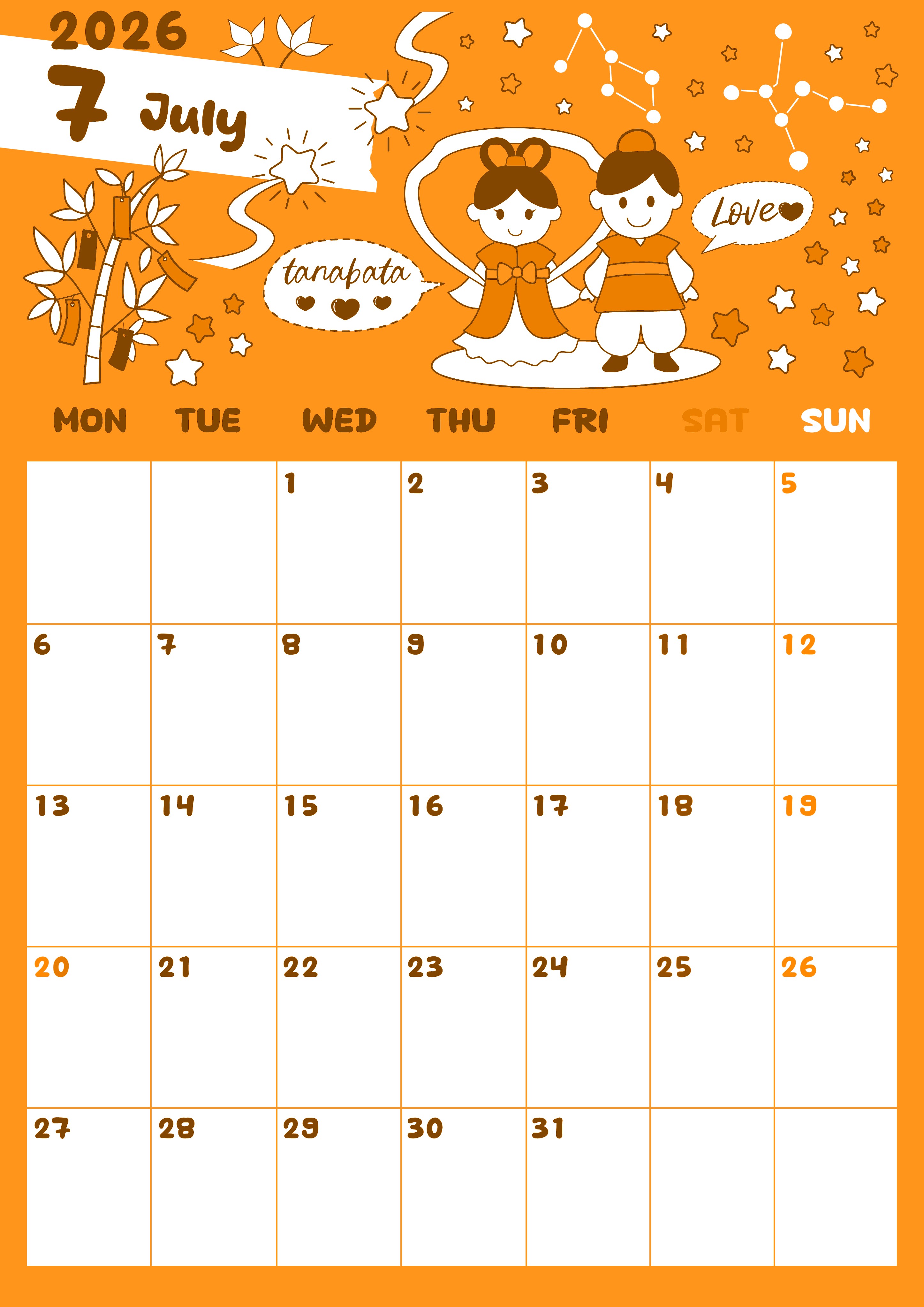 2026年・無料のカレンダーテンプレート 2026年7月縦型月曜始まり ポップなイラストがかわいいA4無料オレンジのカレンダー(2026-01060711) 素材状デザイン王 2025年4月7日 2026年7月縦型月曜始まりの無料テンプレートオレンジのカレンダーです。月曜始まりオレンジのカレンダーなので勉強や仕事の把握がしやすいフォーマットです。イラストはポップでかわいいです。(2026-01060711) 7月 縦型のカレンダー 月曜始まり オレンジ カレンダーデザイン-0106