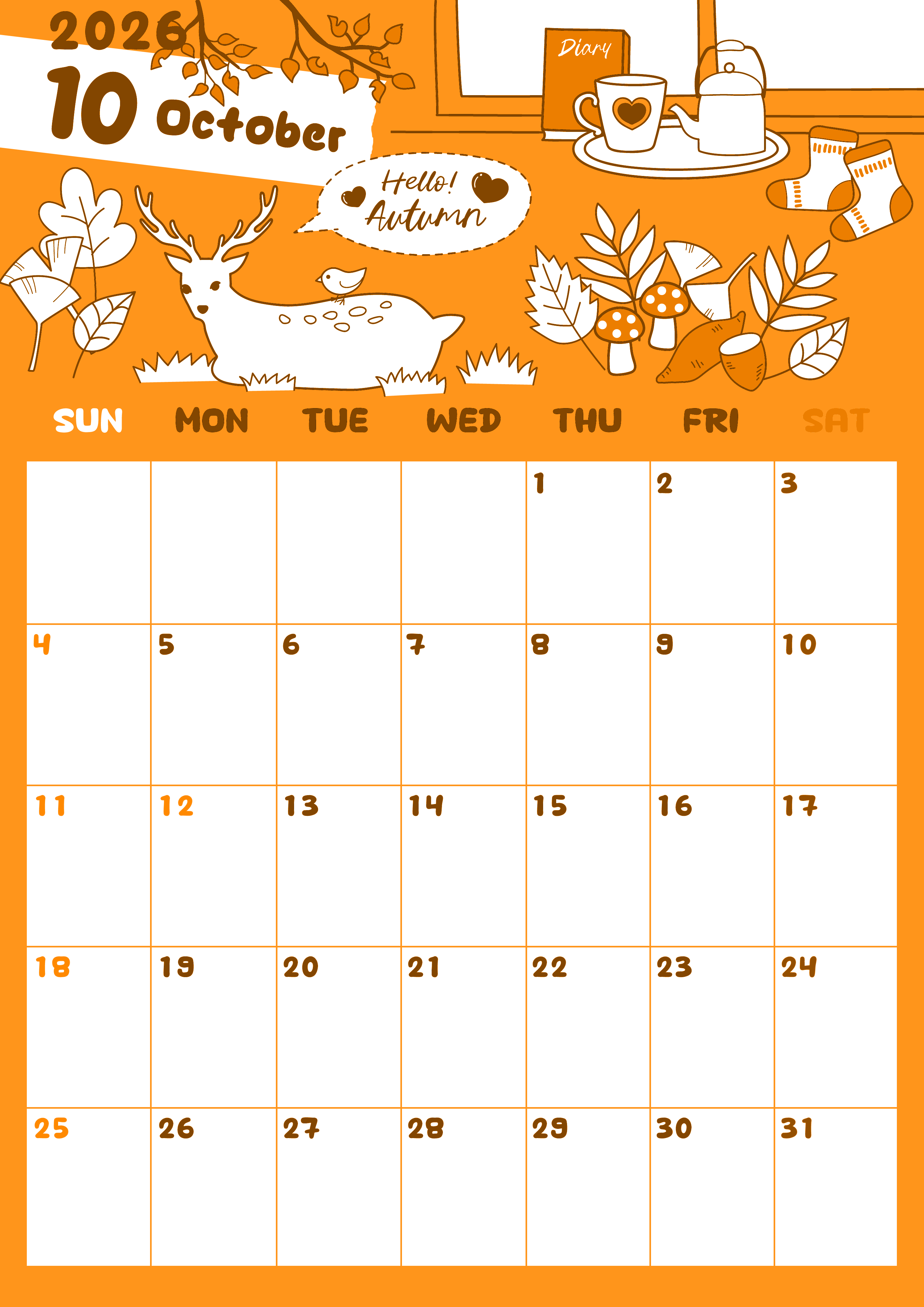 2026年10月縦型日曜始まり 鹿のイラストがかわいいA4無料オレンジのカレンダー(2026-01061010)