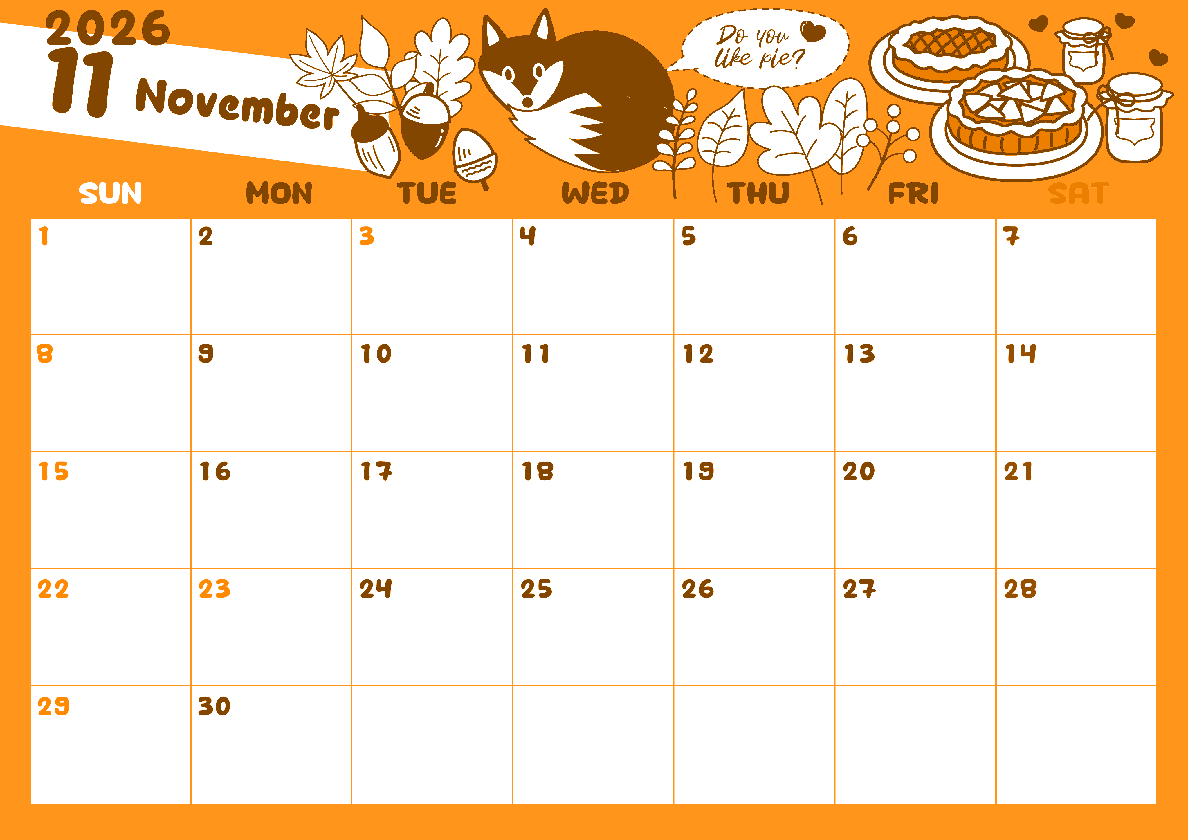 2026年・無料のカレンダーテンプレート 2026年11月横型日曜始まり アップルパイのイラストがかわいいA4無料オレンジのカレンダー(2026-01061100) 素材状デザイン王 2025年4月7日 2026年11月横型日曜始まりの無料テンプレートオレンジのカレンダーです。アップルパイを題材にしたかわいいイラストです。罫線も数字の文字フォントもくっきりしているので実用性があります。(2026-01061100) 11月 横型のカレンダー 日曜始まり オレンジ カレンダーデザイン-0106
