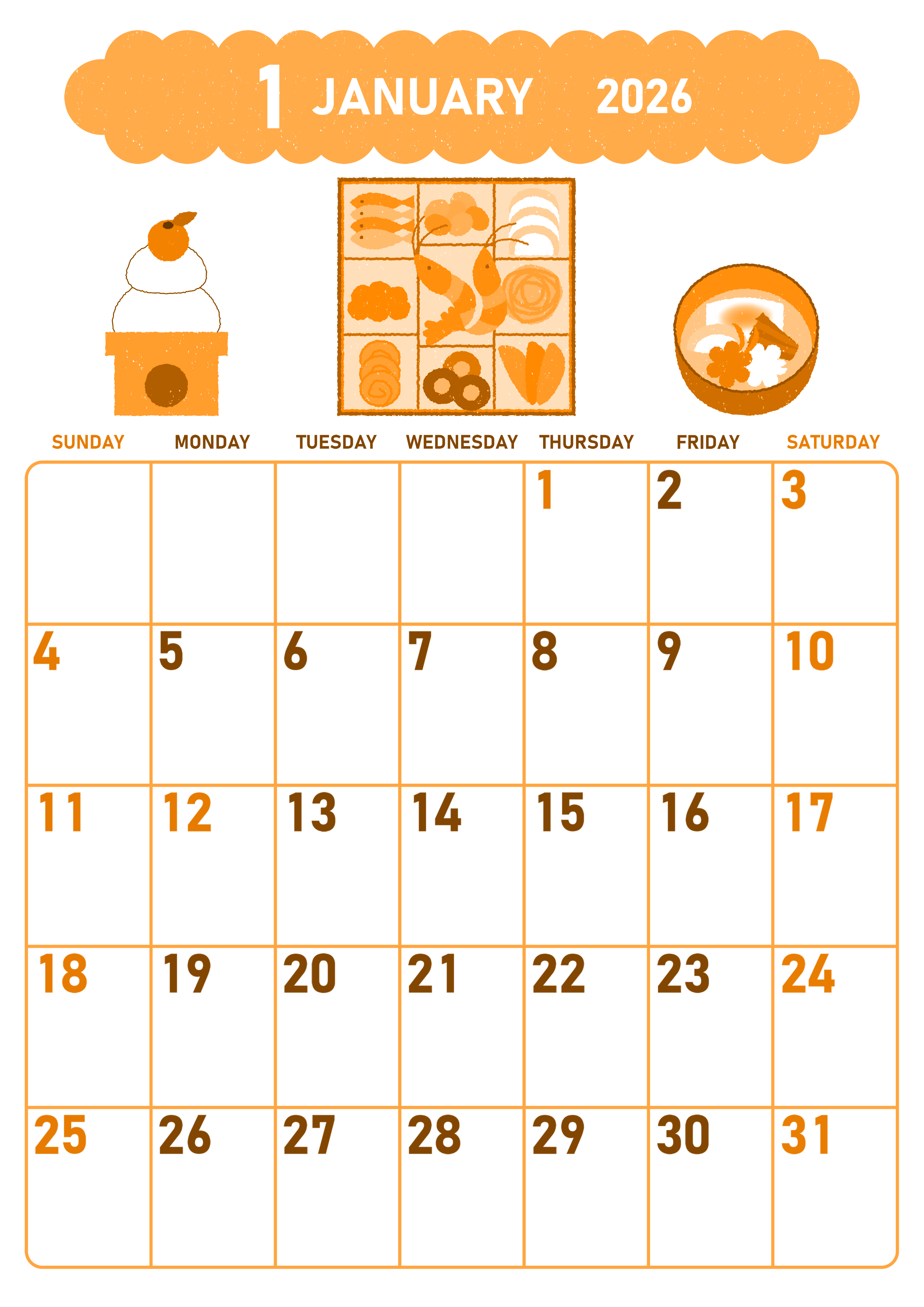 2026年1月縦型日曜始まり おいしいお節イラストのかわいいA4無料オレンジのカレンダー(2026-01070110)