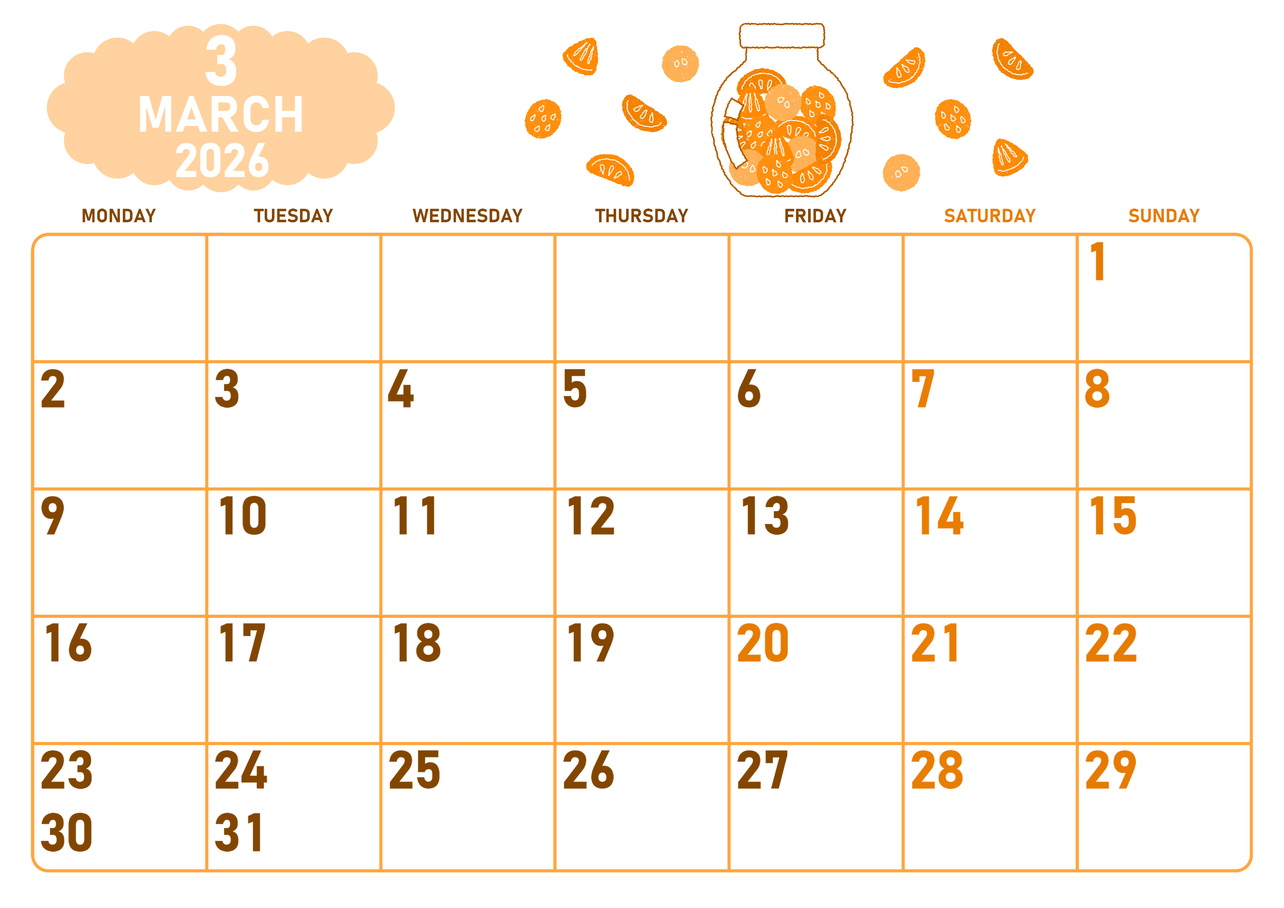 2026年3月横型月曜始まりの無料テンプレートオレンジのカレンダーです。色とりどりのみずみずしい果物の飴玉がポップでかわいい元気をもらえるオレンジのカレンダー素材はダウンロードが無料で月曜始まりです。(2026-01070301)