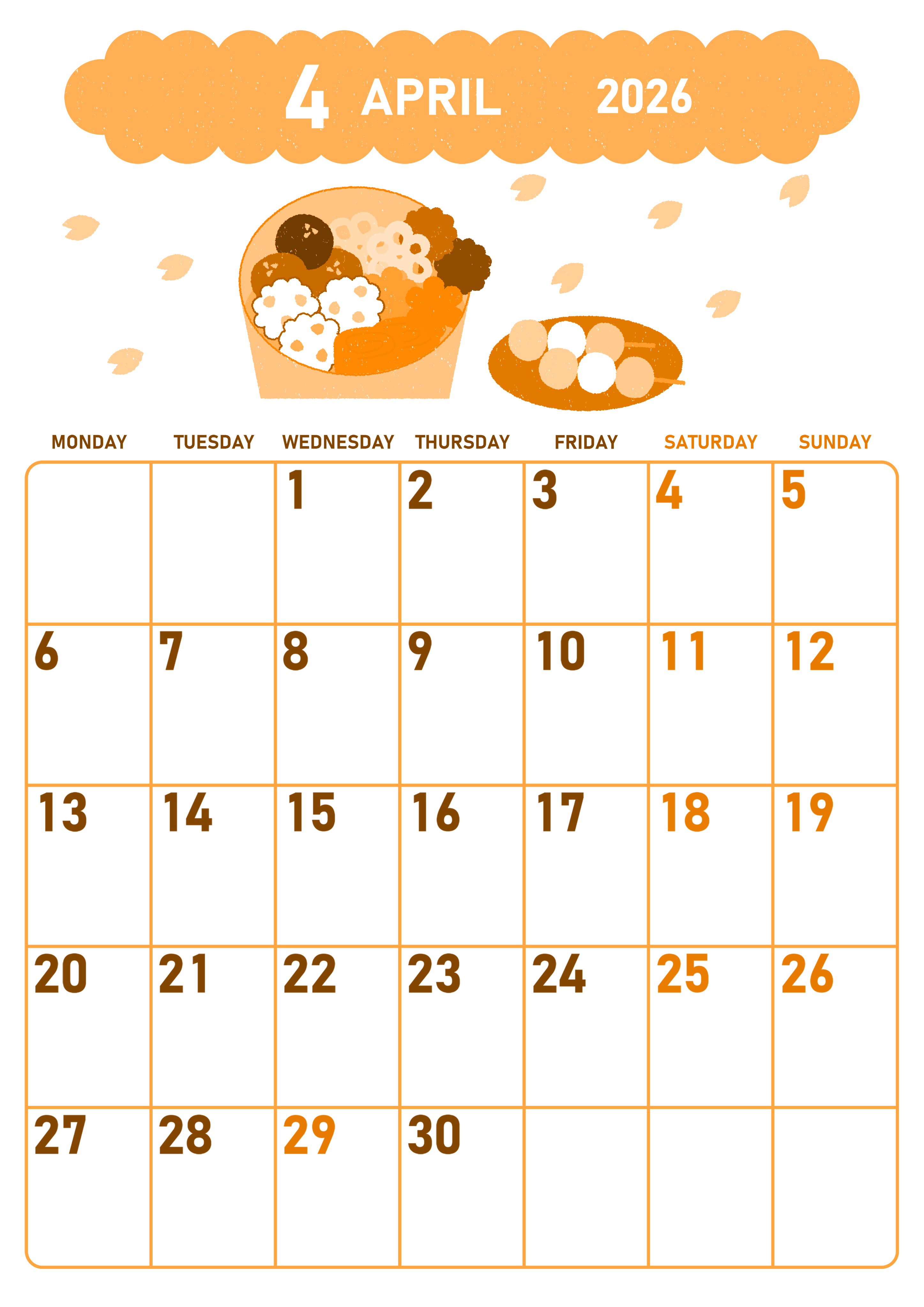 2026年4月縦型月曜始まりの無料テンプレートオレンジのカレンダーです。お花見で食べる三色団子はおいしいですよね。春らしいかわいいイラストがアクセントになっているシンプルなオレンジのカレンダーの無料素材です。(2026-01070411)