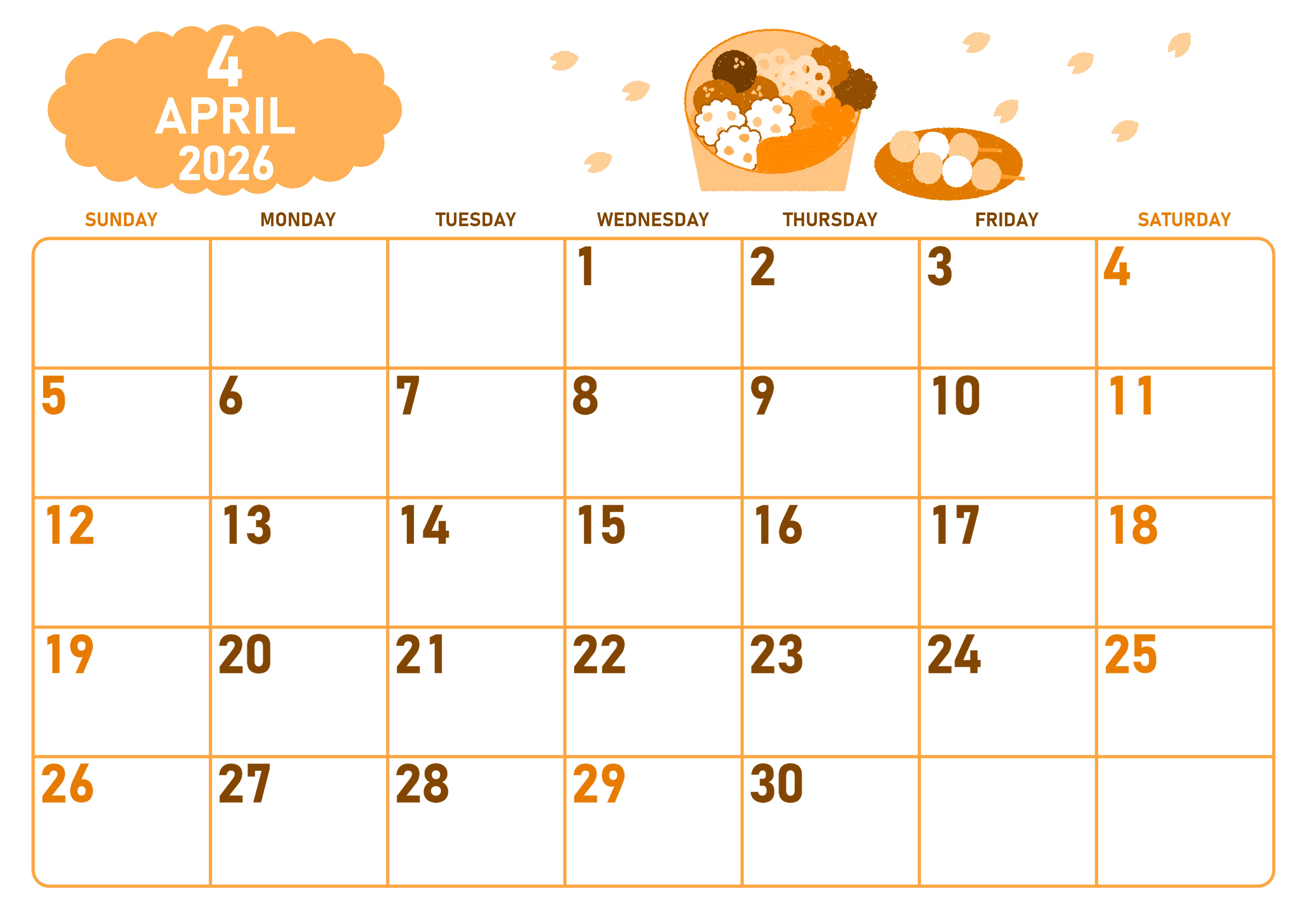 2026年4月横型日曜始まりの無料テンプレートオレンジのカレンダーです。お花見で食べたいお団子やいろいろな食材が目白押しのかわいいイラストがチャームポイントな無料オレンジのカレンダーとなっています。(2026-01070400)